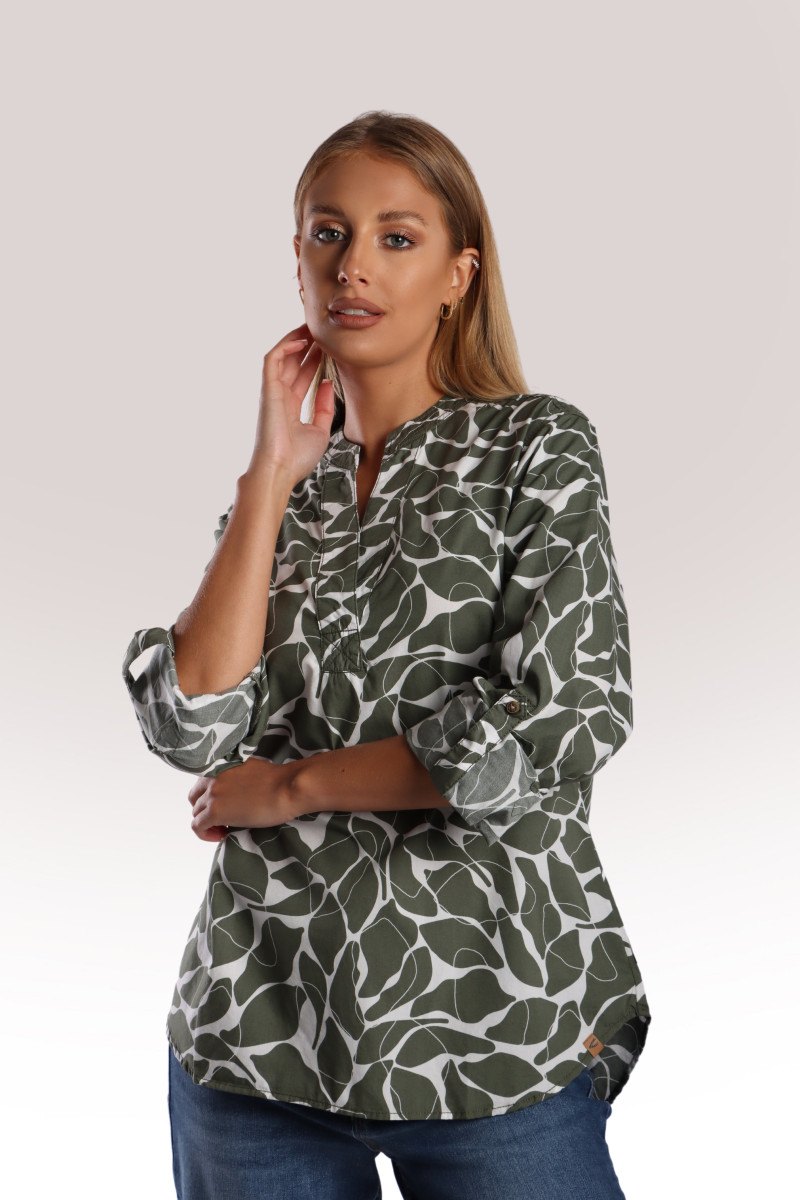 Dámska vzorovaná košeľa s trojštvrťovým vyhrnutým rukávom voľného strihu a nakladaným vreckom na hrudi. Originálny vzor dáva vyniknúť charakteristickému letnému vzhľadu košele a tým jej prepožičiava ležérny a zároveň luxusný nádych. Materiálové zloženie zaručuje dokonalú ľahkosť, priedušnosť.