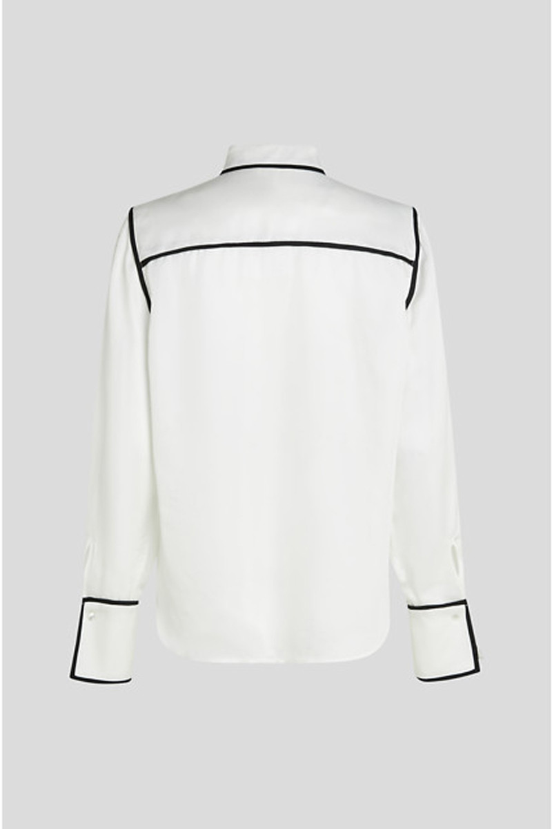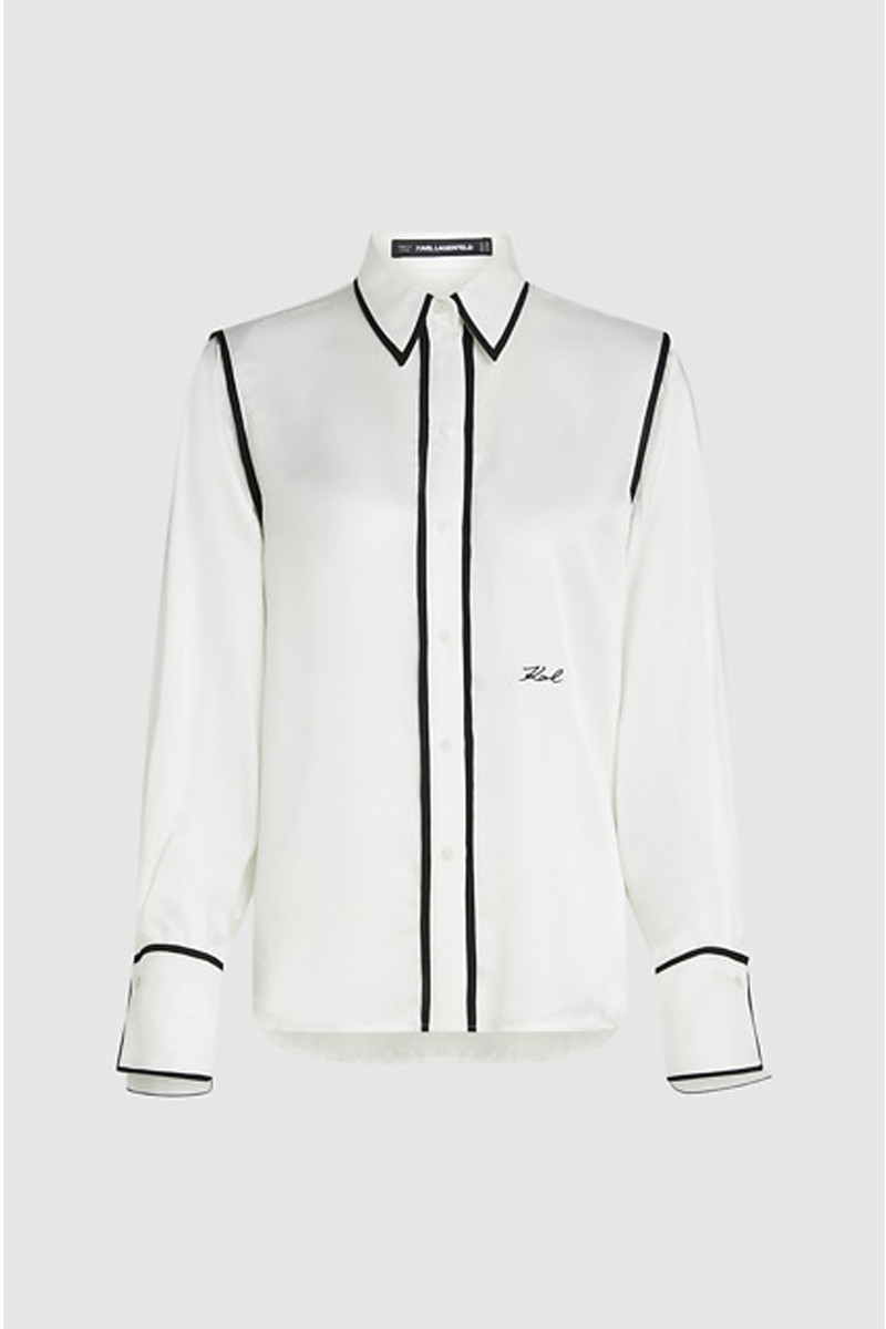 Dámska saténová košeľa rovného strihu. Jednofarebný dizajn s kontrastným lemovaním, golierom a skrytým zapínaním na gombíky dopĺňa Karl Signature logo na prednej strane. Krásne splývavé zloženie materiálu zaručuje dokonalú priedušnosť, jemný lesk a mimoriadne príjemný pocit pri nosení. Dokonale kombinovateľný kúsok, ktorý podčiarkne Vašu ženskosť v každom ležérnom aj elegantnom outfite.