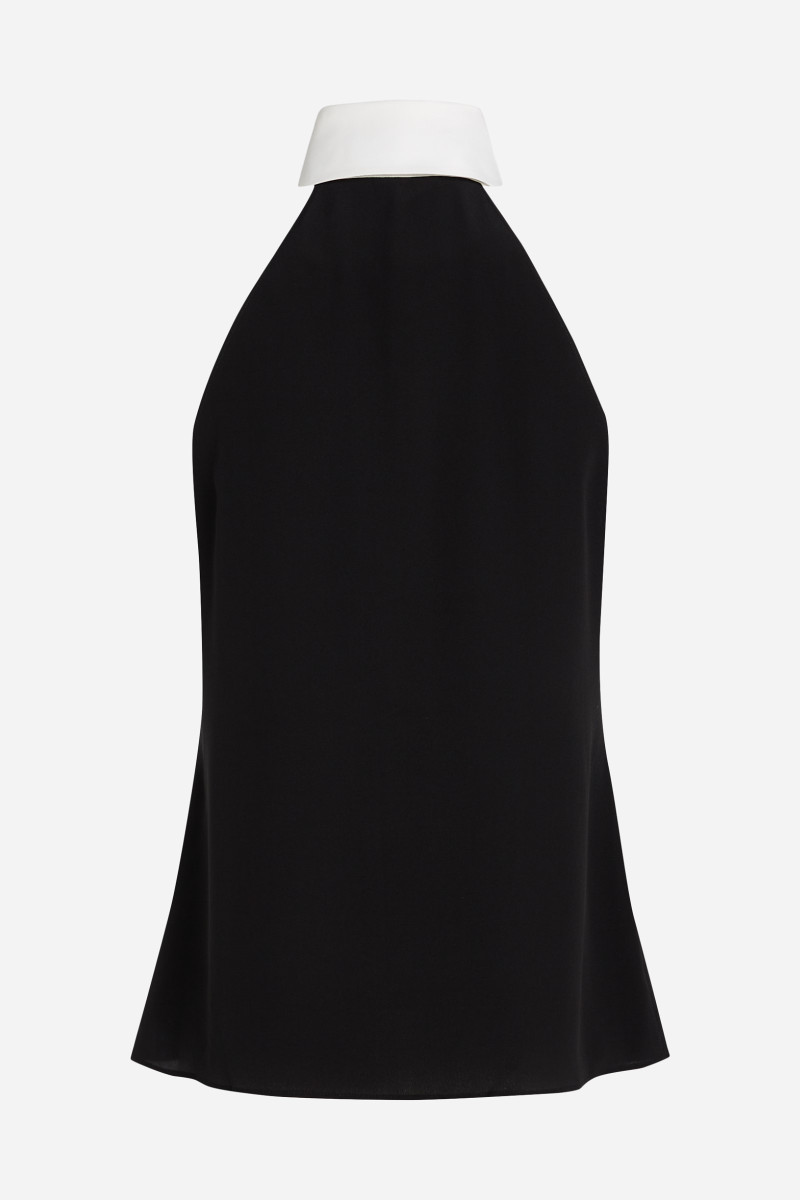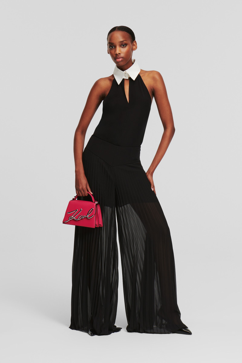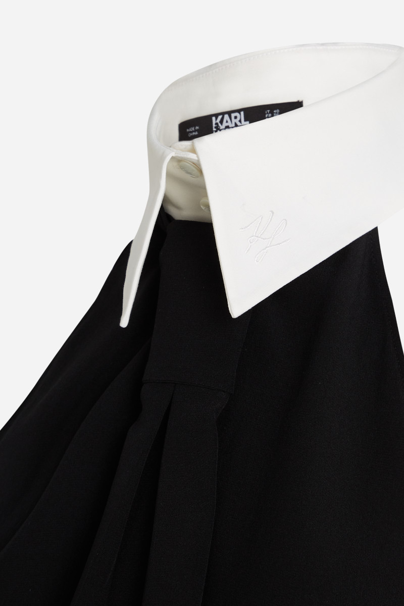 Dámska blúzka bez rukávov s vysokým kontrastným bielym golierom a čiernou kravatou s vyšívaným logom Karl Autograph, inšpirovanou ikonickou estetikou Karla Lagerfelda. Jemná výšivka loga zdobí golier a dodáva nenápadný, ale výrazný povrch. Krásne splývavé zloženie materiálu zaručuje dokonalú priedušnosť, jemný lesk a mimoriadne príjemný pocit pri nosení. Nezameniteľne štýlový kúsok, ktorý bude ozdobou Vášho denného aj večerného outfitu.