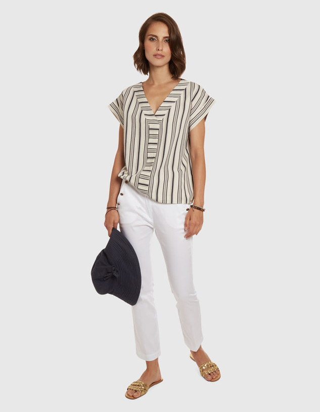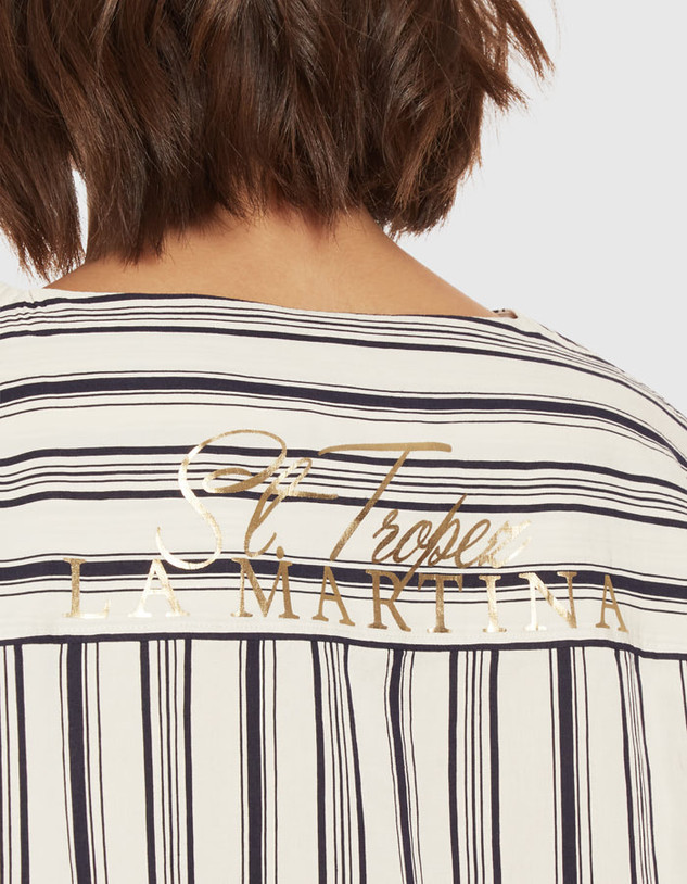 Dámska blúzka so spadnutým rukávom vo voľnom padavom strihu s rovnomernými prúžkami výborne ukáže k jeansom alebo sukni. Viskózový materiál je veľmi priedušný a ľahký čo zaručuje komfort pri nosení počas horúcich letných dní.