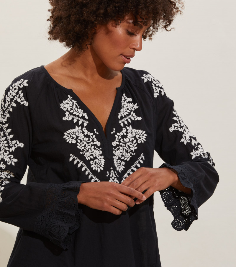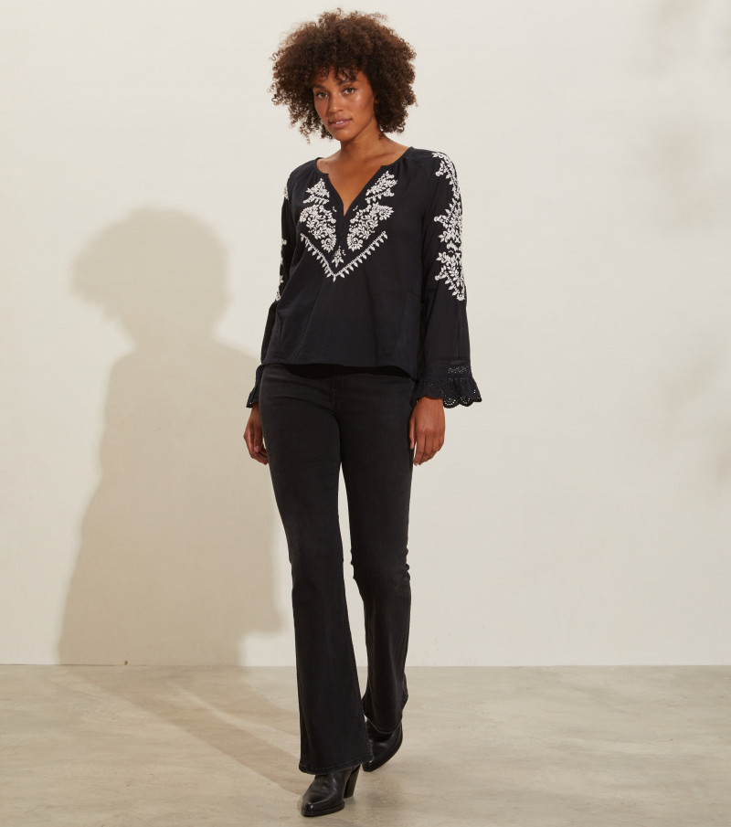 Vyšívaná dámska blúzka s raglánovými rukávmi. Tie ukončuje volánik s anglickou výšivkou. Lem véčkového výstrihu je stiahnutý do originálnej slzy. Odd Molly medailónik našitý v hornej zadnej časti. Vysokokvalitná 100-percentná bavlna je príjemná na dotyk a veľmi pohodlná. Originálny jemný vrchný kúsok vhodný k jednoduchým nohaviciam na každodenné nosenie.
