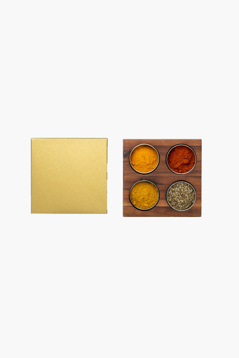 Elegantná krabička z kolekcie Yellow Box až po otvorení odhalí svoju skutočnú funkciu: originálny stojan na koreničky. Štvorcovú základňu z akáciového dreva dopĺňajú štyri poháre z borosilikátového skla a zlatistý poklop z eloxovaného hliníka. Tento sofistikovaný kúsok vznikol na základe špecifických potrieb, ktoré boli študované a vyvíjané pre špičkové hotely a reštaurácie. KNINDUSTRIE prenáša tieto profesionálne skúsenosti na Váš každodenný stôl. Priemer jedného pohára: 6 cm, výška pohára: 4,5 cm.