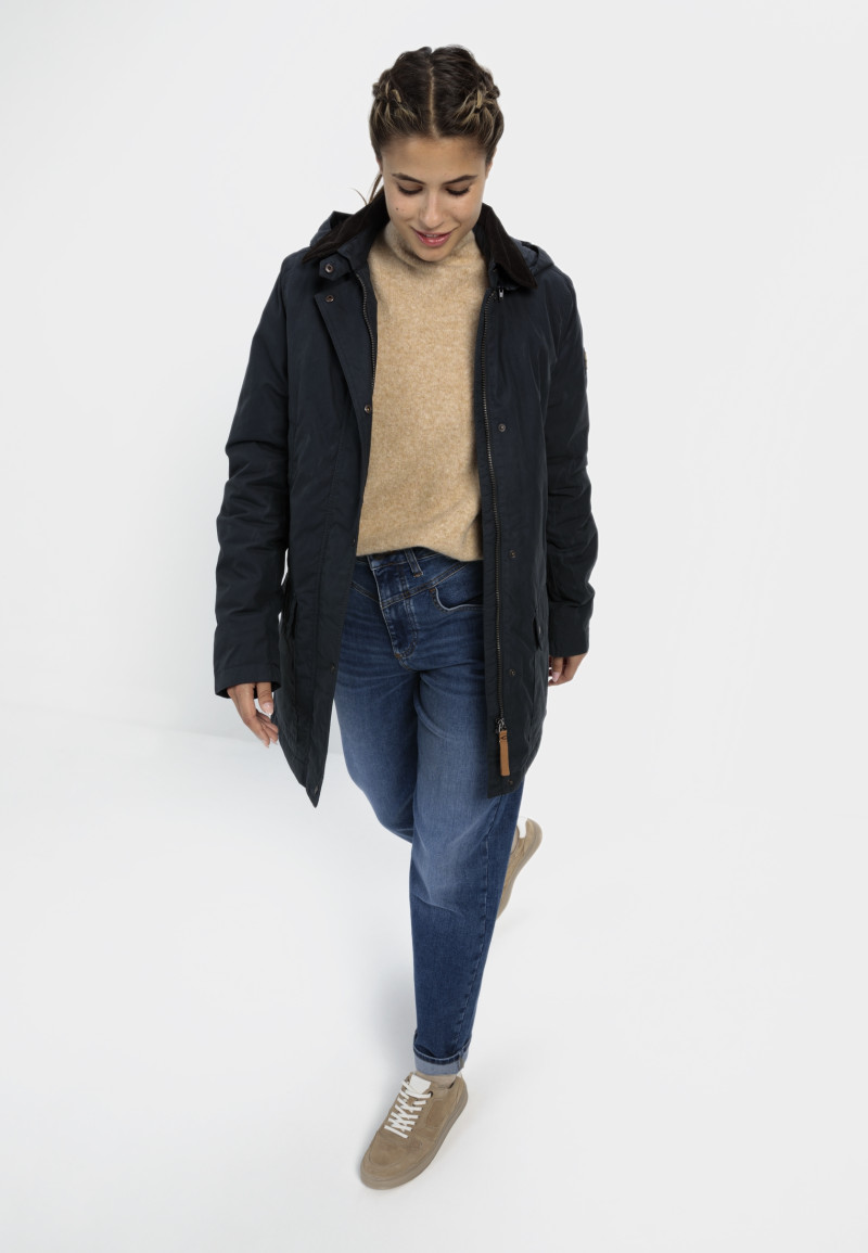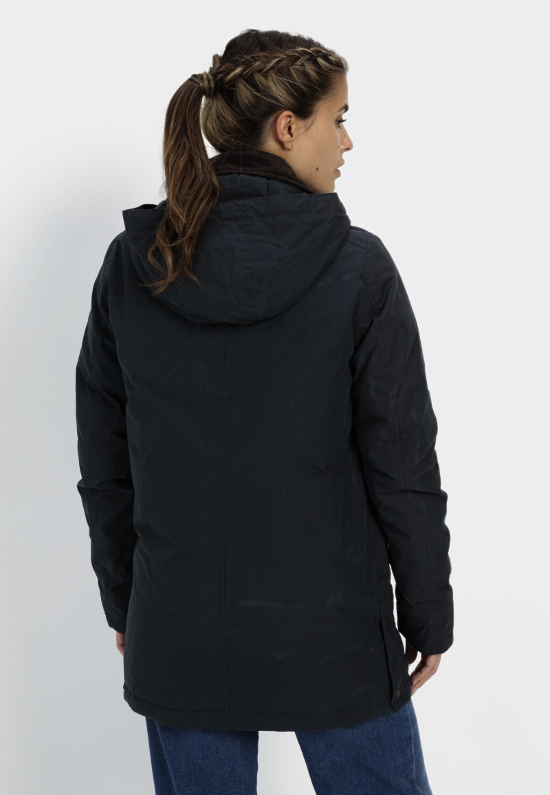 Dámska zimná bunda, ktorá Vás zaujme svojim prepracovaným dizajnom a funkčnými detailmi. Voľný strih s voskovaným povrchom a výrazným mančestrovým golierom dodáva jedinečný vzhľad, ktorý sa dobre hodí k ležérnym outfitom. Odnímateľná kapucňa poskytuje dodatočnú ochranu a flexibilitu v závislosti od počasia. Vybavená viacerými vonkajšími a vnútornými vreckami a légou na patentky so zapínaním na zips. Nechýba logo Camel Active umiestnené na rukáve. Dokonale praktický a všestranný kúsok, ktorý štýlovo doladí Váš outfit. Modelka meria 173 cm a nosí veľkosť 36.