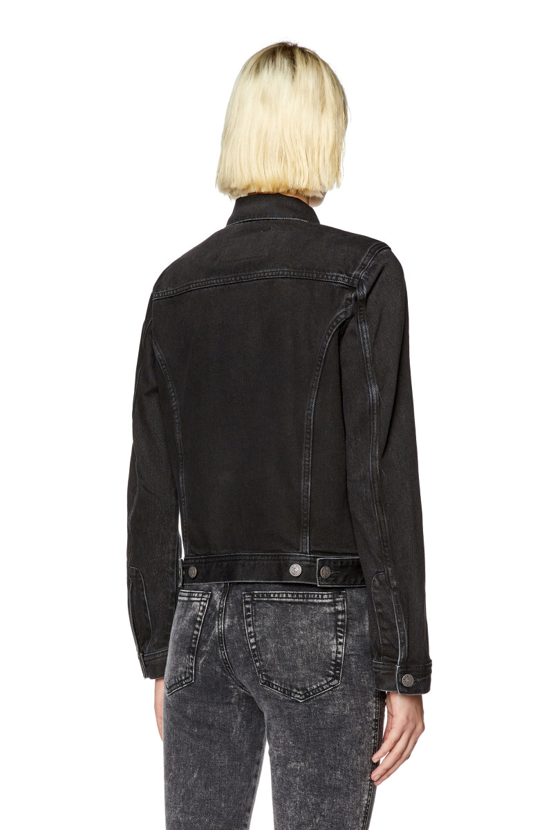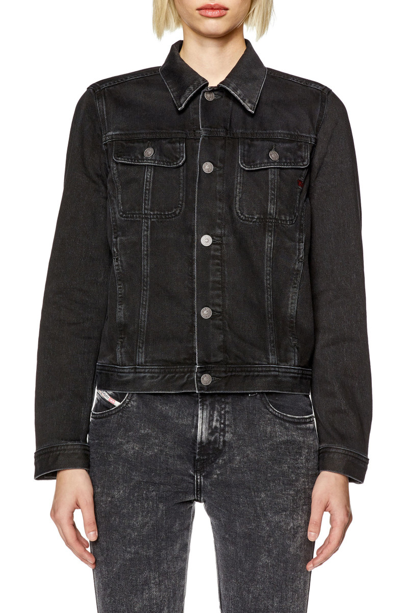 Dámska džínsová bunda v trucker štýle. Rovný regular-fit strih. Klasická, nadčasová silueta. Čisto čierny wash je vyrobený z pevného, bavlneného denimu. Má náprsné vrecká, bočné sťahovacie prvky a manžety na gombíky. Jedno z vreciek je zdobené vyšívaným, červeným a kontrastným logom ,,D". Modelka má na sebe veľkosť S a je 175 cm vysoká.