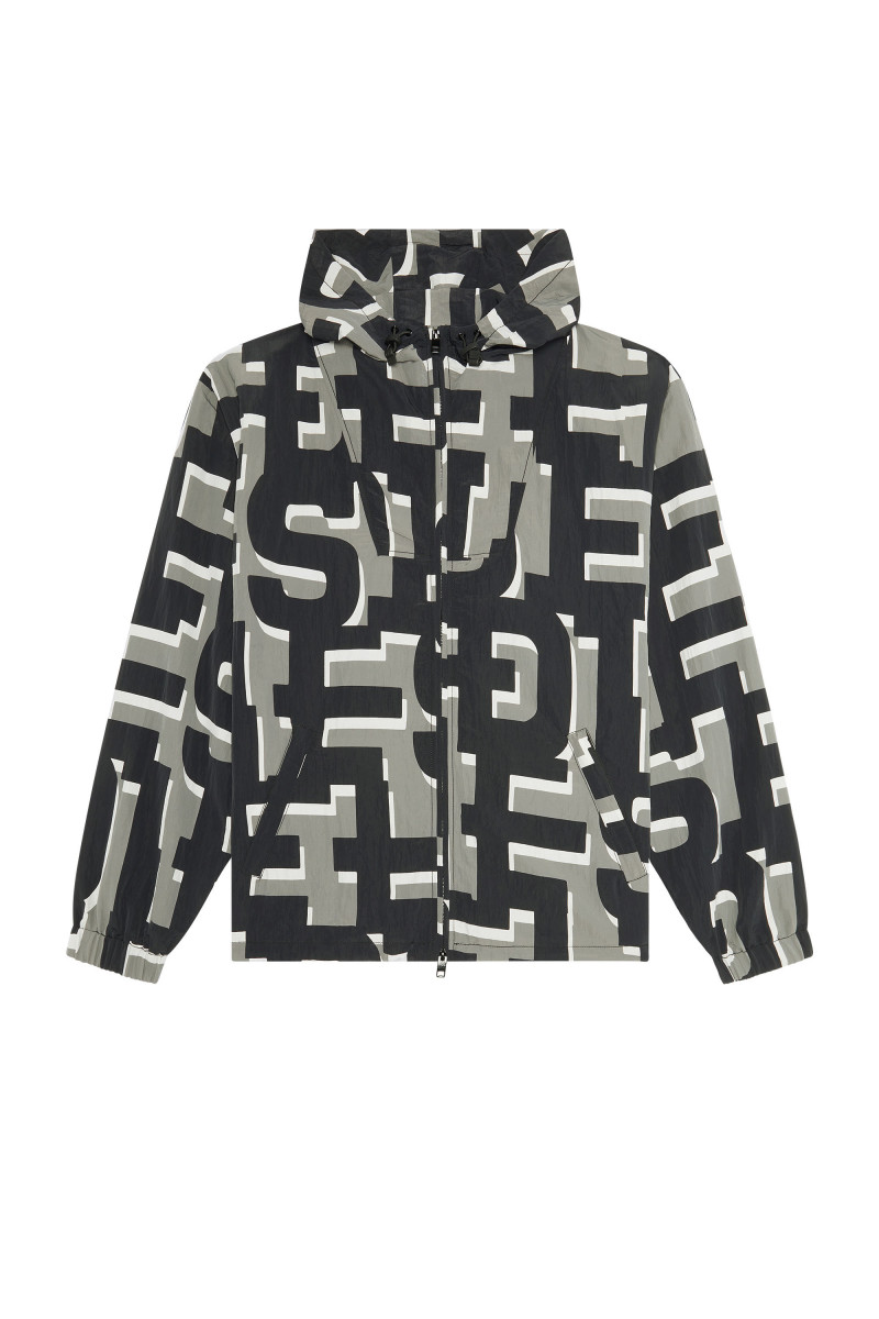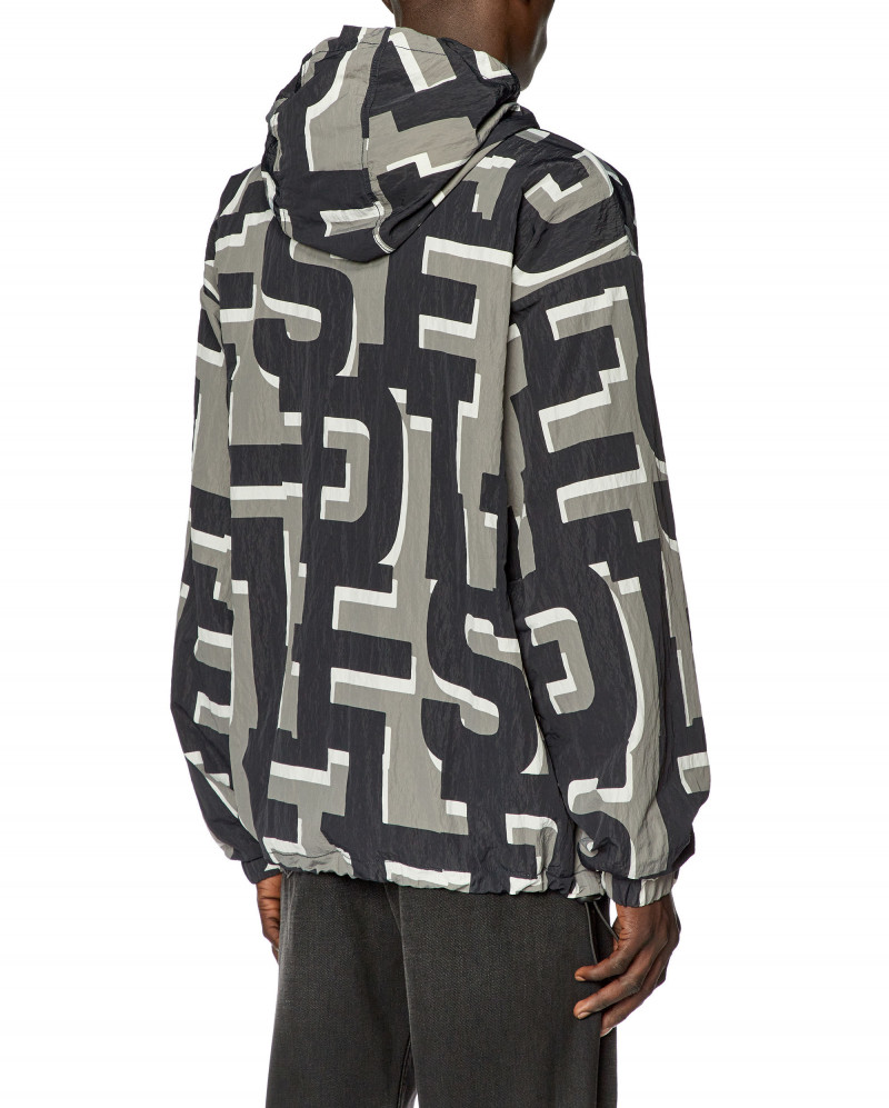 Pánska vetrovka. Regular rovný voľný strih so spadnutými ramenami. Vyrobená z ľahkého krčeného nylonu. Vybavená veľkorysou kapucňou a lemom na sťahovaciu šnúrku. Zdobená celoplošnou tlačou monogramu nadmernej veľkosti. Zapínanie na dvojcestný zips. Elastické manžety na rukávoch. Podšívka zo sieťoviny. Bočné vrecká. Model má na sebe IT veľkosť 48 a meria 188 cm.