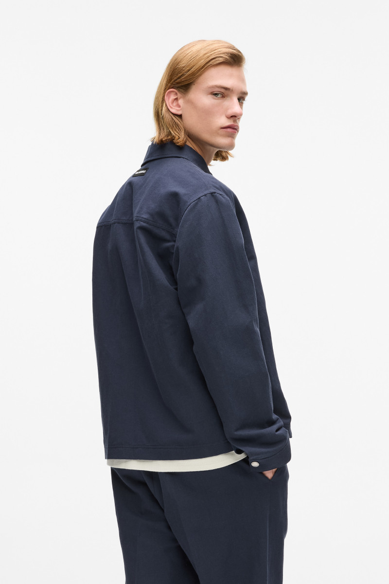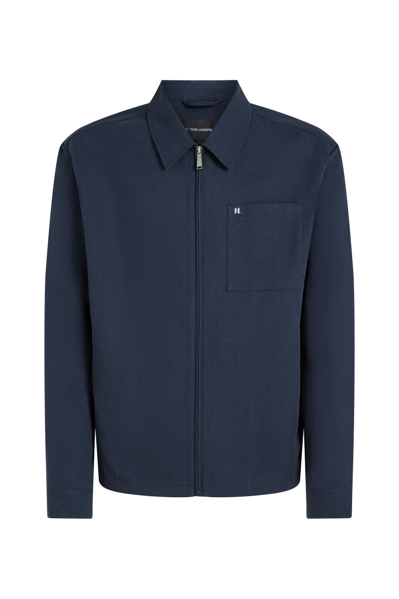 Pánska bunda s golierom. Rovný strih, pásová dĺžka, zapínanie na zips. Priestranné náprsné vrecko, sofistikované prešívanie a nenápadné strieborné logo Karl Monogram. Materiálové zloženie povrchovej tkaniny je tvorené vysokým podielom ľanového vlákna prémiovej kvality, ktoré v kombinácii s ľahkou bavlnenou podšívkou je zárukou dokonalej vzdušnosti a neobyčajne príjemného pocitu počas nosenia. Prvotriedne spracovanie kvalitného materiálového zloženia je zárukou vysoko komfortného pocitu počas nosenia. Štýlový kúsok, ktorý možno kombinovať s plátennými nohavicami a košeľou a vytvoriť tak elegantný, ležérno-elegantný outfit.