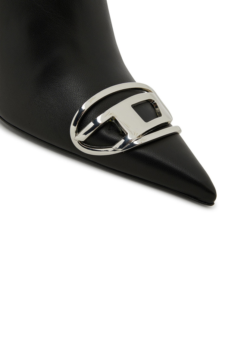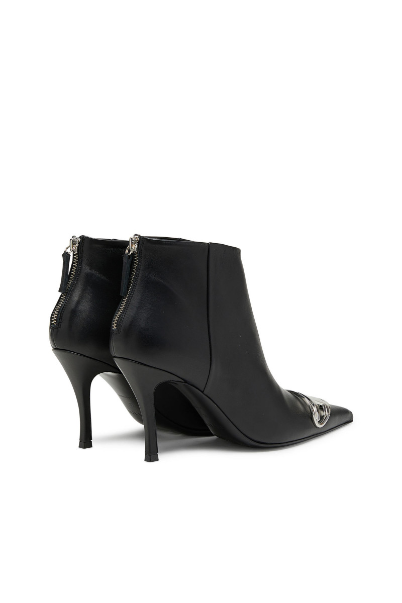 Dámske členkové topánky. Vyrobené z poddajnej čiernej kože. Výrazné špičky, sú odvážne doplnené lešteným kovaním oválneho loga písmena „D“ v striebornom odtieni. Zapínajú sa na zips pozdĺž zadnej strany. Tenké podpätky o výške 90 mm.