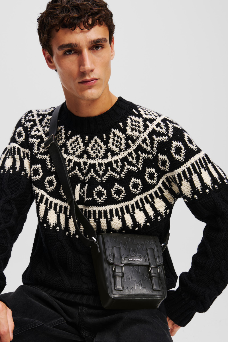 Pánska crossbody taška zdobená celoplošným reliéfnym dizajnom Karl Monogram a kovovým logom na prednej strane. Drobná, praktická silueta so zapínaním na pracky vybavená nastaviteľným crossbody popruhom zaisťuje pohodlie a štýl na cestách. Bavlnený interiér je vybavený vreckom so zapínaním na zips. Povrchový materiál je tvorený hladkou hovädzou kožou prémiovej kvality, ktorá sa vyznačuje mimoriadnou pevnosťou a odolnosťou, zároveň nestráca svoj luxusný vzhľad. Nezameniteľne štýlový doplnok, ktorý skvele doladí Váš neformálny outfit.
