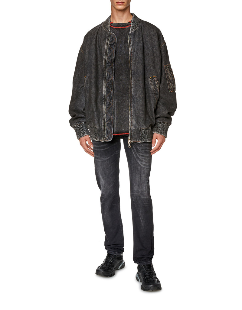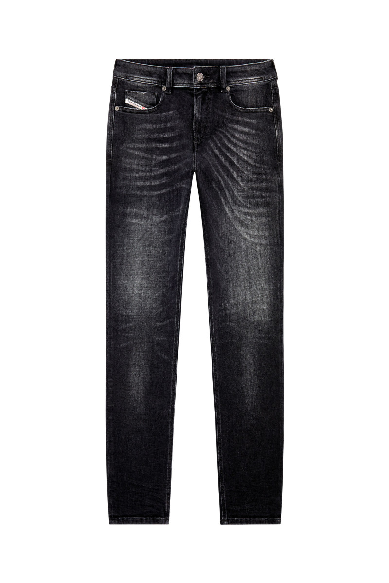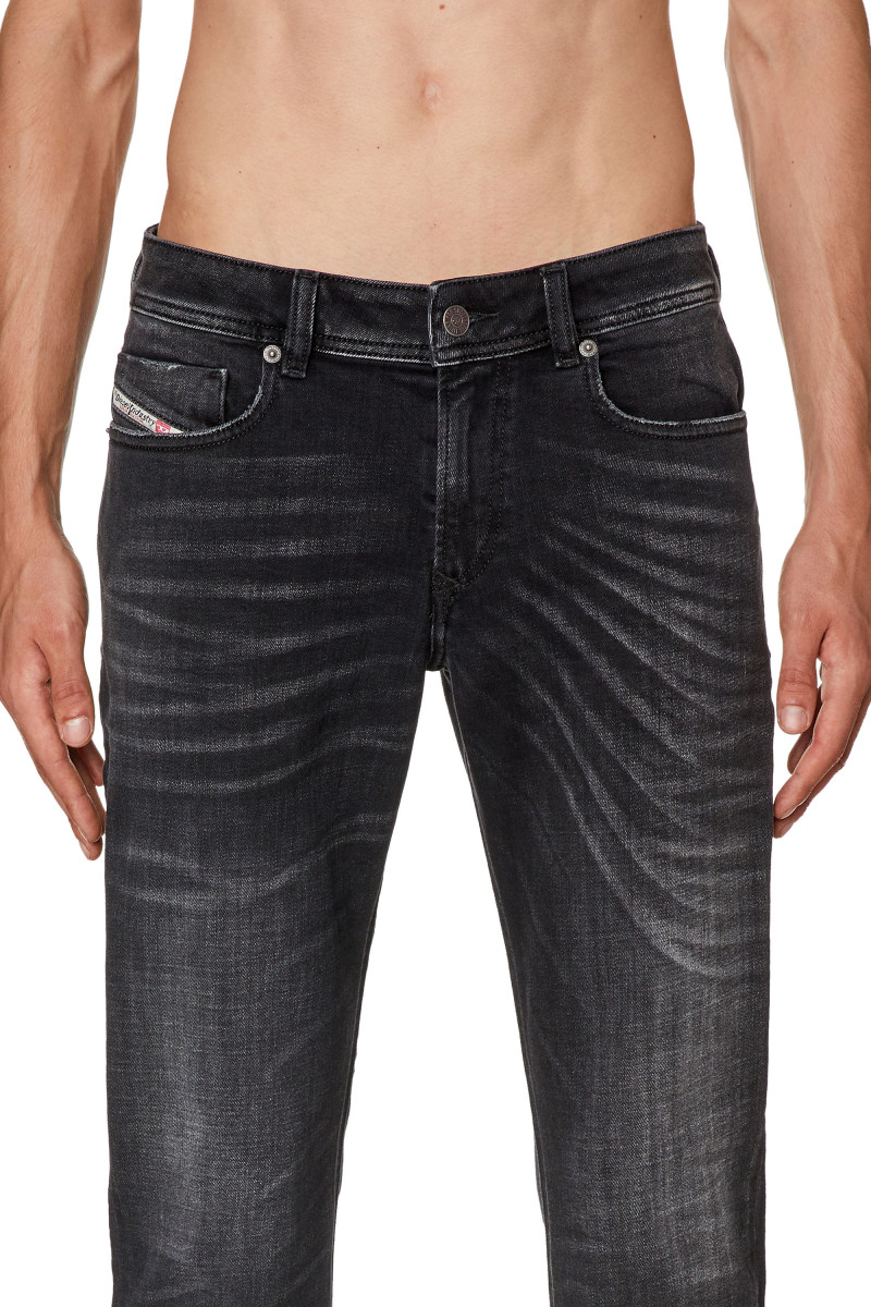 Pánske úzke džínsy s nízkym pásom. Nohavice sú zúžené od stehna smerom k členku. Dizajn navrhnutý s ohľadom na punk-rockový štýl. Tento tmavosivý strečový denim vyrobený z organickej bavlny zmiešanej s recyklovateľným elastanom má viditeľné prešívanie a použité detaily vyrobené revolučnými technikami prania. Efekt minerálneho svetlého ,,špinenia" a 3D povrch umocňujú módny vintage vzhľad. Zapínanie na zips. Detail kontrastného červeného loga písmena ,,D" vyšitého na zadnom vrecku.