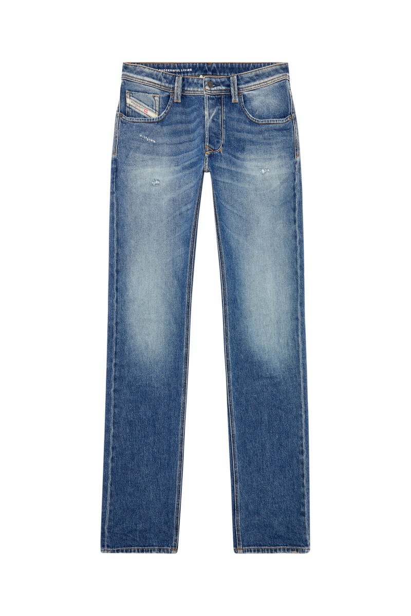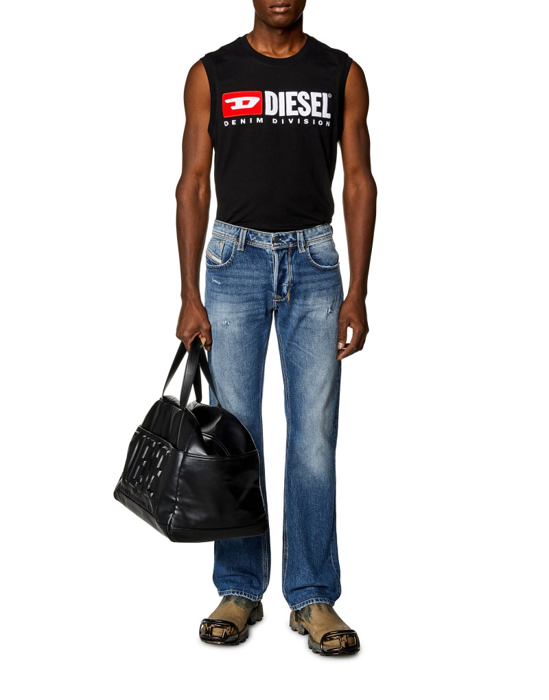 Pánske tapered džínsy so stredne vysokým pásom. Strih je navrhnutý, aby vyhovoval rôznym typom postavy. Zúžený štýl s dostatočným priestorom pre stehná. Noha sa mierne zužuje od kolena po členok. Päťvreckový dizajn s pútkami na opasok a zapínaním na zips dopĺňa ikonický label Diesel Industry našitý na zadnej strane. Vyrobené z čiastočne recyklovanej bavlny, ktorá je zmiešaná so strečom pre väčšie pohodlie. Má modré pranie s vyblednutými časťami a jemnými odreninami. Model má na sebe veľkosť 31 a meria 182 cm.