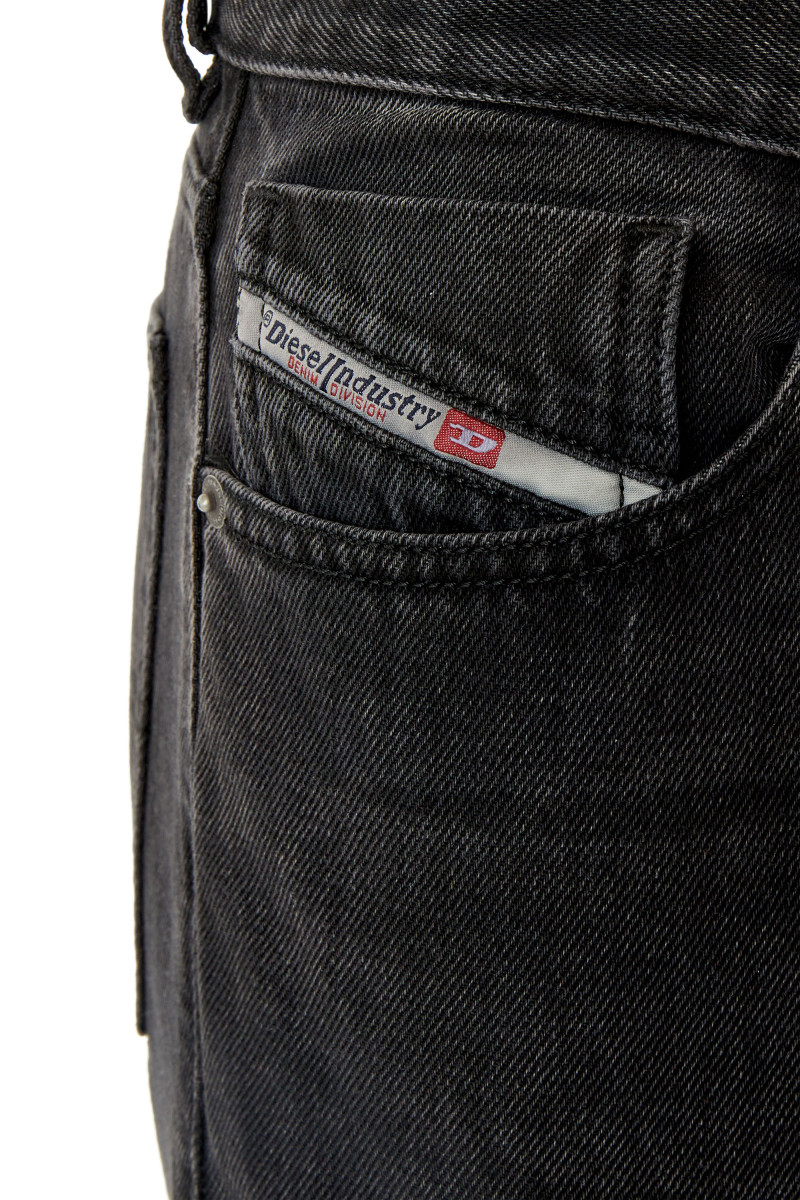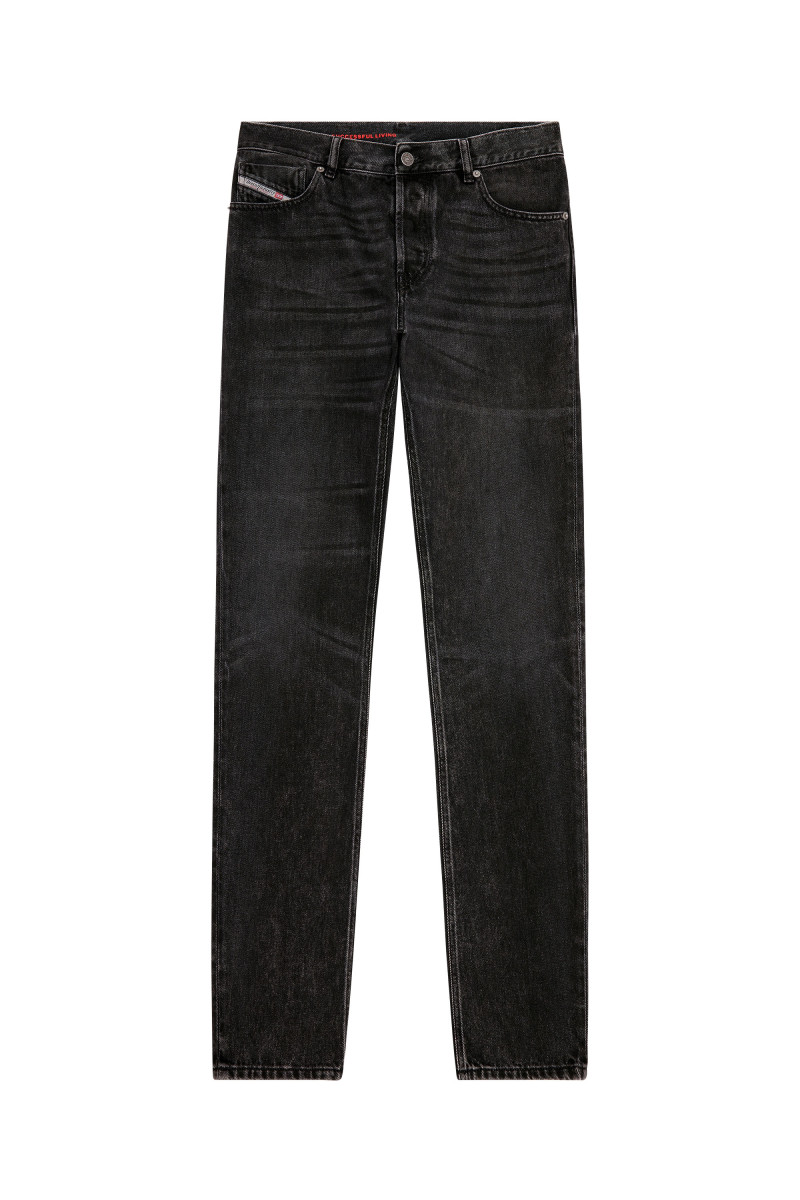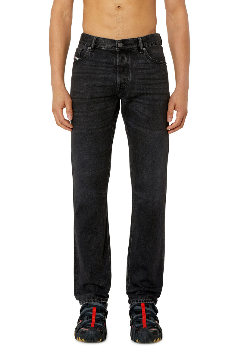 Pánske úzke džínsy. Strih so stredne vysokým pásom a rovnými nohavicami. Tento model, inšpirovaný techno hudbou polovice 90. rokov má originálny vzhľad značky Diesel. Má čierny wash a je vyrobený z pevného denimu. Zapínanie na gombíky. Model má na sebe veľkosť 31 a meria 182 cm.