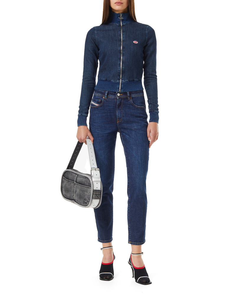 Dámske slim fit džínsy. Strih so stredne vysokým sedom a tapered nohavicami zúžujúcimi sa od kolien smerom dole ku členkom. Silueta vyžaruje sviežu, ležérnu atmosféru. Tmavomodrý wash, vyrobený zo strečového denimu. Upravené s ľahkým vrásnením a celoplošným ošetrením. Zapínanie na zips. Modelka má na sebe veľkosť 26 a meria 175 cm. Zodpovedá bežnému číslovaniu, pri výbere zvoľte svoju obvyklú veľkosť.