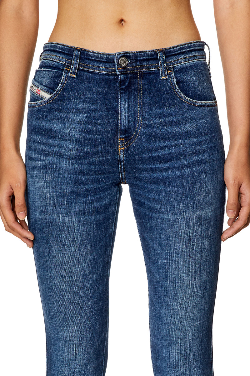 Dámske úzke skinny džínsy so stredne vysokým pásom. Úzký štýl s pravidelným pásom, ktorý premosťuje priepasť medzi priliehavým denimom a tradičným rovným vzhľadom. Konštrukcia a čistý vzhľad tohto denimu sú zakončené zipsom a sú inšpirované klasickými džínsami. Vyrobené z pružného denimu s čiastočne recyklovanými vláknami. Predstavuje tmavomodré pranie so svetlými úpravami. Modelka má na sebe veľkosť 27 a je vysoká 177 cm.