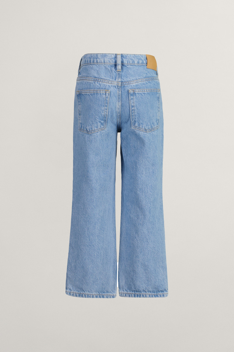 Detské džínsy moderného dizajnu s voľným strihom nohavíc. Štandardné nohavicové zapínanie dopĺňa praktický detail pružného sťahovania z vnútornej strany pása a pútka na opasok. Nechýba ani kožený label s vytlačeným Gant nápisom nad zadným nakladaným vreckom. Materiálové zloženie odolnej, avšak na dotyk príjemne mäkkej denimovej tkaniny je tvorené bavlneným vláknom prémiovej kvality, ktoré je zárukou veľmi pohodlného pocitu počas nosenia. Všestranne kombinovateľný kúsok, ktorý voľnočasovému outfitu dodá štýlový, trendy vzhľad.
