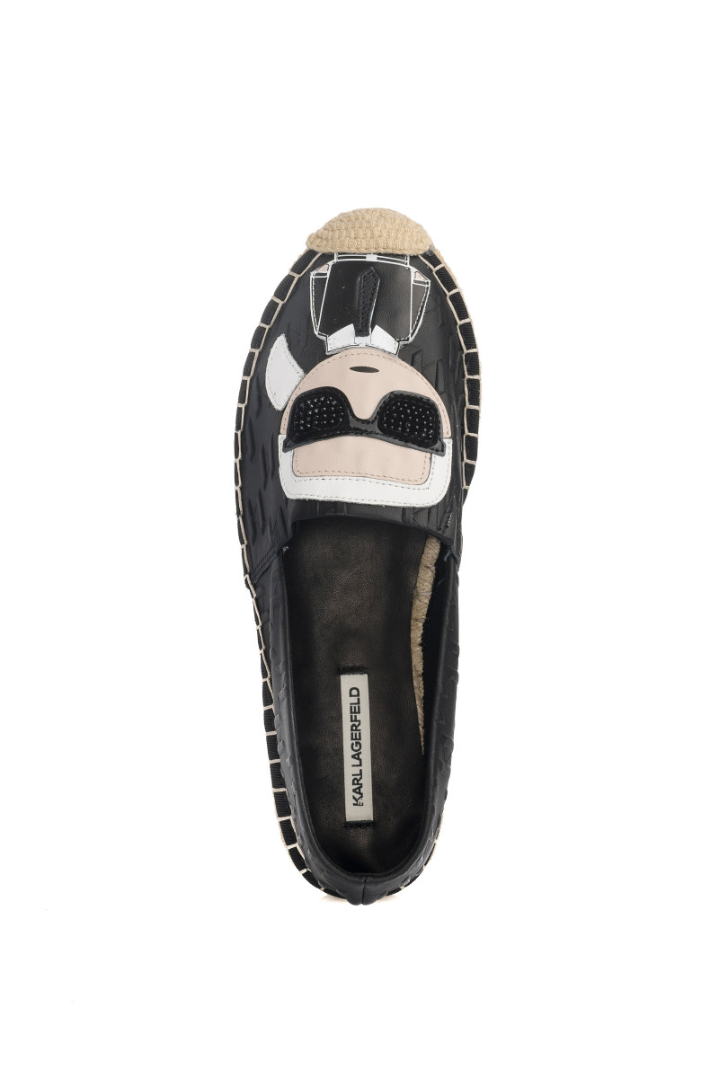 Dámske espadrilky z hovädzej usne prémiovej kvality, ktoré si vás získajú svojou ľahkosťou, originalitou a vtipom. Celkovému spracovaniu dominuje ikonická čierno-biela postavička Karla na priehlavku, vytlačený monogram KL na povrchu a ľahká podrážka s prírodným konopným vláknom. Pohodlný bavlnený interiér je opatrený koženou stielkou. Nezameniteľne štýlová obuv na voľný čas, ktorá vám dokonale spríjemní letné dni.