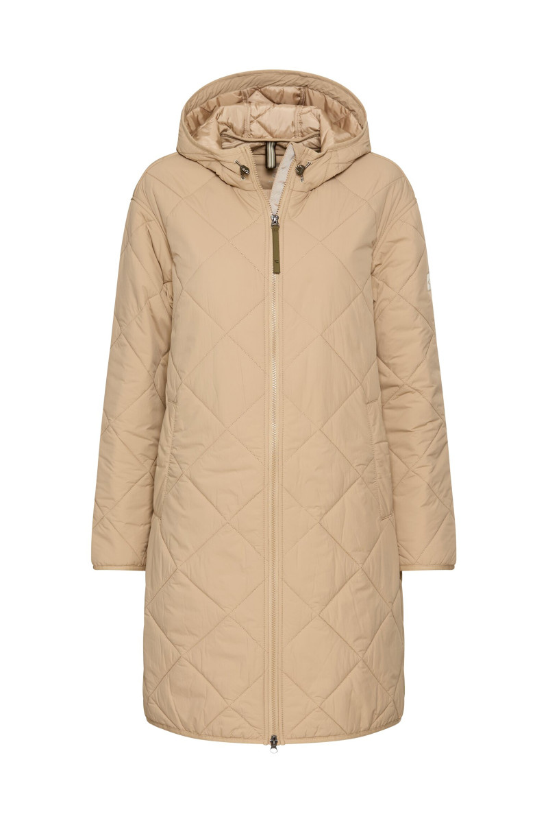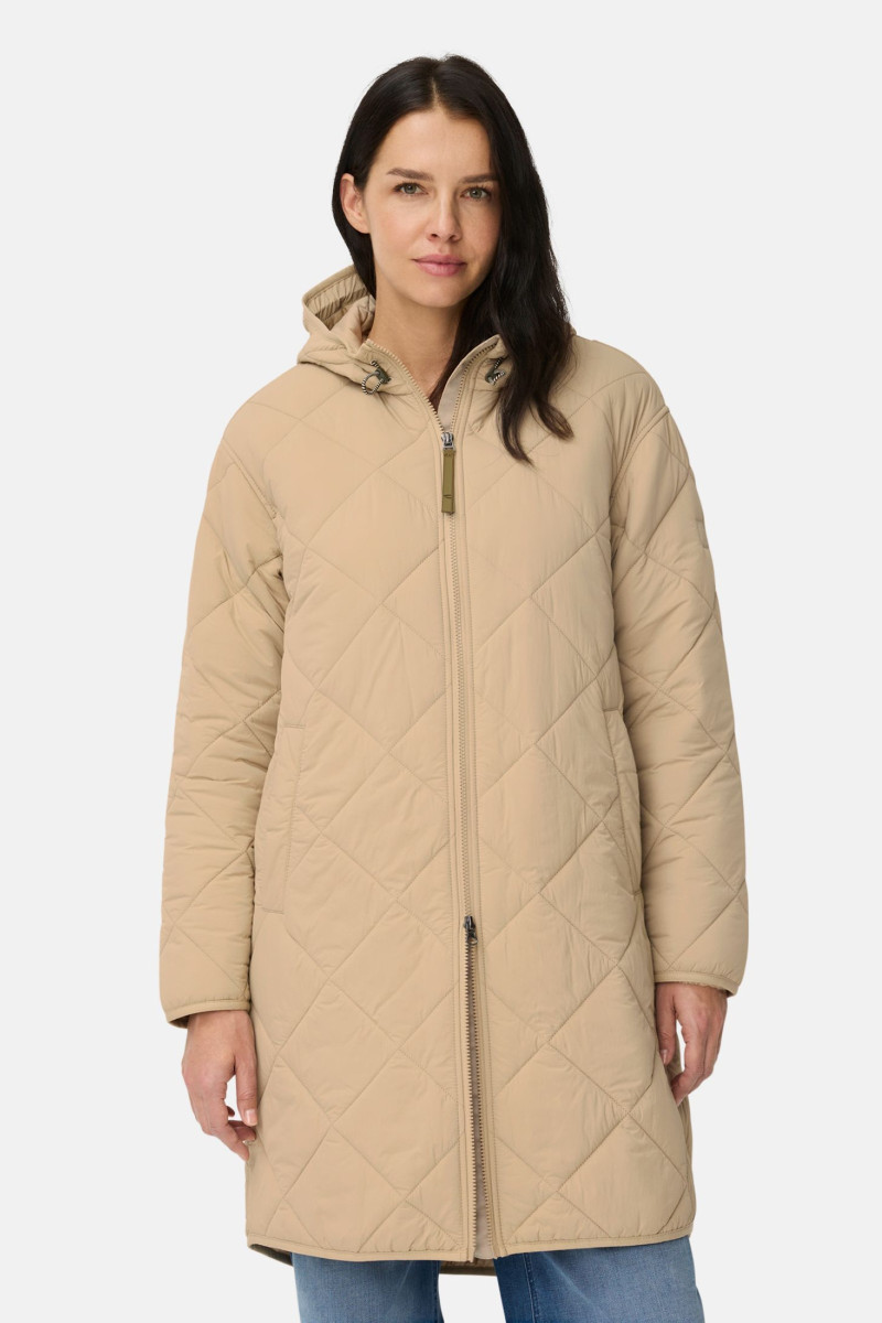 Dámsky prešívaný kabát s kapucňou napevno. Dĺžka nad kolená, dvojitý zips vedený k stojačiku. Rovný strih s moderným prešívaným vzorom. Vďaka materiálovému zloženiu je kabát veľmi pohodlný a praktický na údržbu. Perfektná voľba na každodenné nosenie.