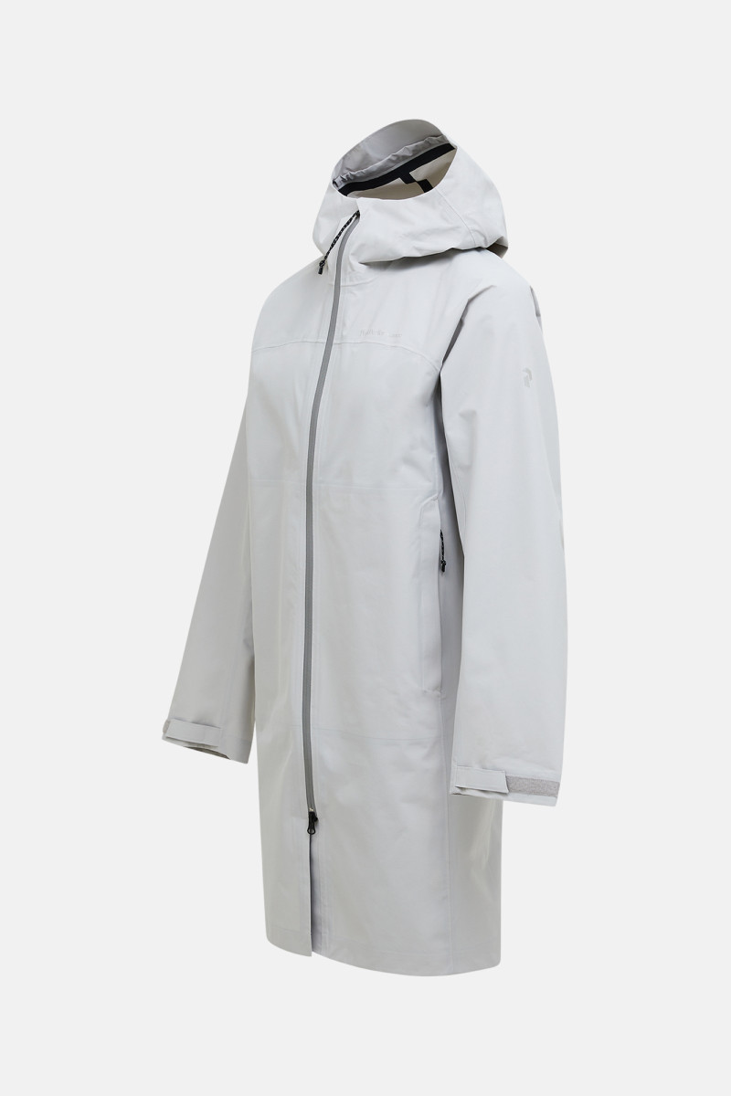 Pánsky kabát s kapucňou. Voľný strih s laminovanými okrajmi, pútkom na zavesenie na vonkajšej strane krku a pevnú, obojsmerne nastaviteľnú kapucňu dopĺňajú raglánové rukávy, nastaviteľné manžety na rukávoch so suchými zipsami pre lepšie prispôsobenie a ochranu, vnútorné vrecko a vrecká na ruky na zips ako aj logo P na rukáve a potlač Peak Performance na hrudi. Zapínanie obojsmerným zipsom YKK AquaGuard® Vás ochráni pred nepriazňou počasia. Použitá je odolná, vodoodpudivá úprava bez PFC. Materiálové zloženie zaručuje príjemný pocit pri nosení, ľahkosť a skvelé funkčné vlastnosti vďaka 2,5 - vrstvovej tkanine s technológiou HIPE®. Priedušnosť 10 000 gr/m2/24 h, vodný stĺpec 10 000 mm. Tkanina je vetru a vode odolná, ale stále priedušná. Veľmi praktický, ľahký, všestranný a štýlový kúsok pre Vaše outdoorové zážitky za každého počasia.