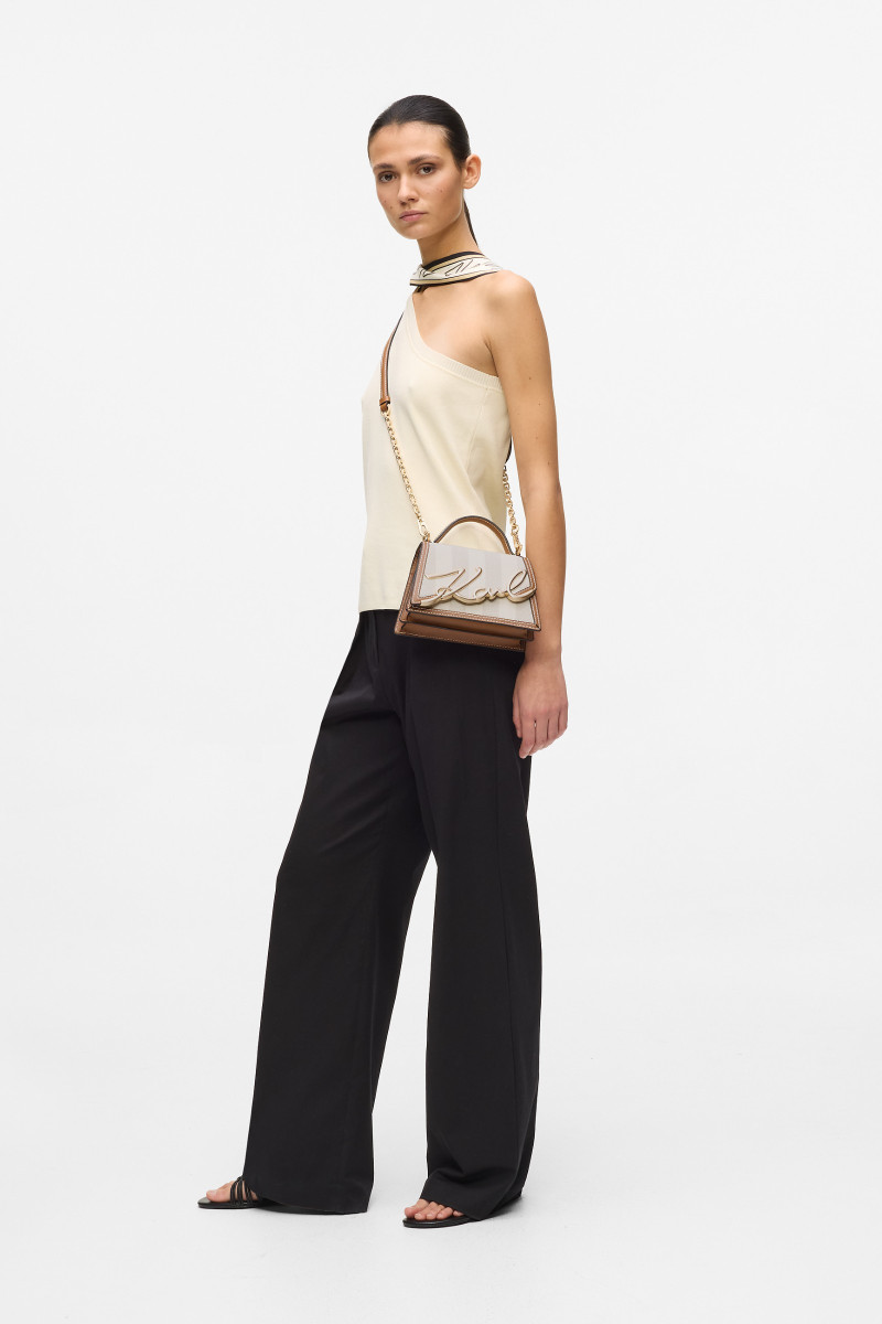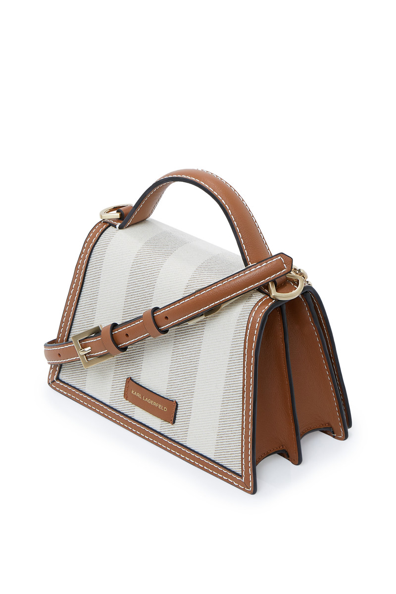 Dámska crossbody kabelka K/SIGNATURE je definovaná svojou siluetou v tvare lichobežníka a skoseným logom na chlopni, ktorá má uzatváranie na magnet. Pruhovaný bavlnený dizajn je doplnený koženým lemovaním. Hladká hovädzia useň prémiovej kvality je veľmi pevná a odolná, zároveň nestráca svoj luxusný vzhľad. Kabelka je vybavená odnímateľným crossbody popruhom a hladkým koženým remienkom pre všestranný styling. Nepopierateľne elegantný a vždy praktický doplnok Vašich outfitov.