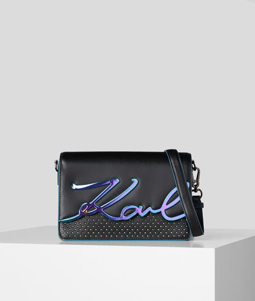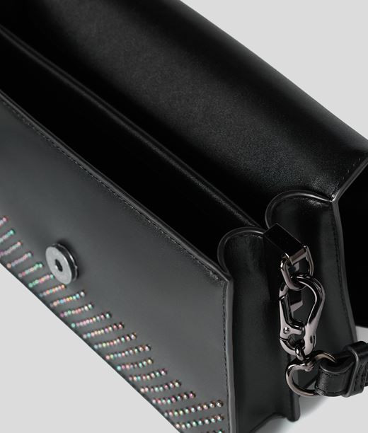 Luxusnú koženú kabelku na nosenie cez rameno definuje meniaci sa podpis KARL a kovové cvočky. Vďaka nastaviteľnému a odnímateľnému popruhu disponuje tento všestranný doplnok mnohými možnosťami stylingu: je možné nosiť ho cez rameno, cez trup aj ako listovú kabelku.