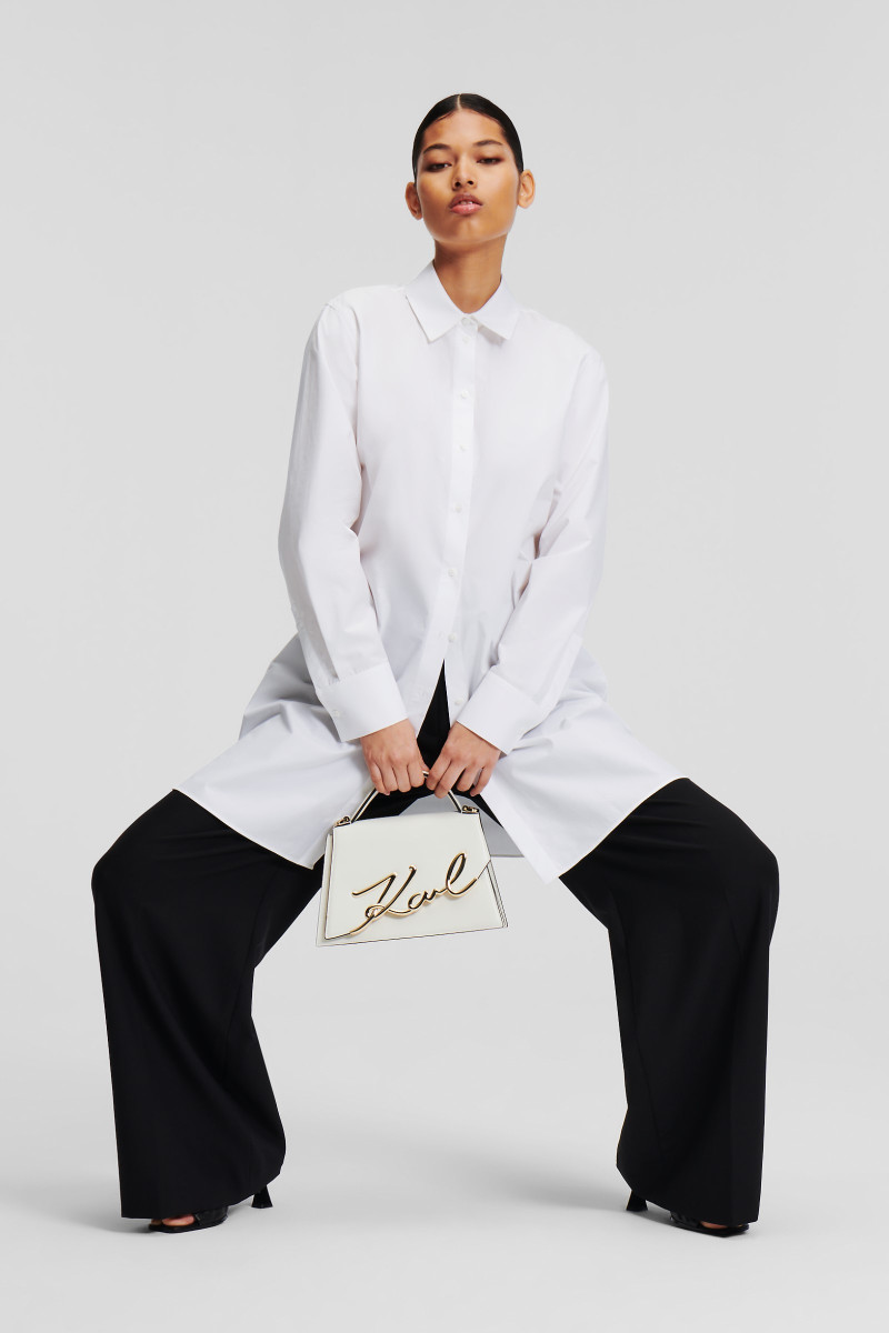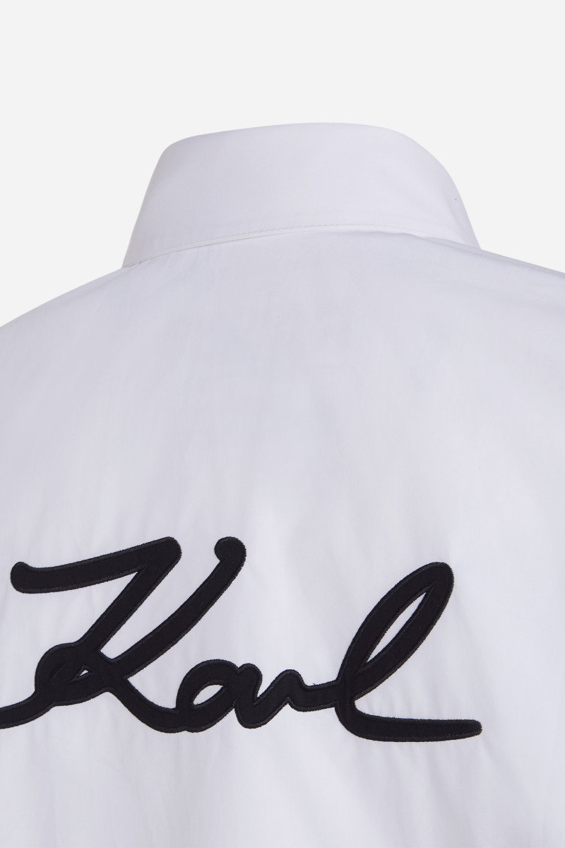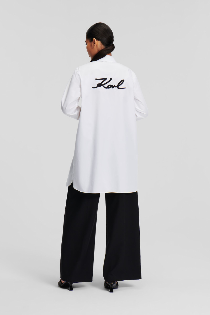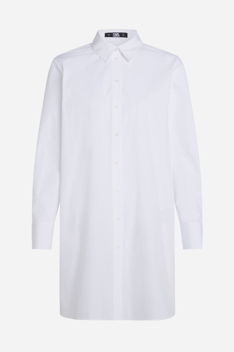 Dámska predĺžená košeľová tunika Karl s dlhými rukávmi a vyšívaným kontrastným logom Karl Signature na chrbáte. Zapínanie na gombíky dopĺňa otvorený golier. Materiálové zloženie je tvorené 100% bavlneným organickým vláknom prémiovej kvality, ktoré je príjemne mäkké na dotyk, pri nosení priedušné a vďaka svojej poddajnosti a flexibilite aj veľmi pohodlné. Kvalitný džersej je zárukou tvarovej aj farebnej stálosti. Tieto klasické a zároveň moderné šaty patria do kolekcie módnych kúskov.