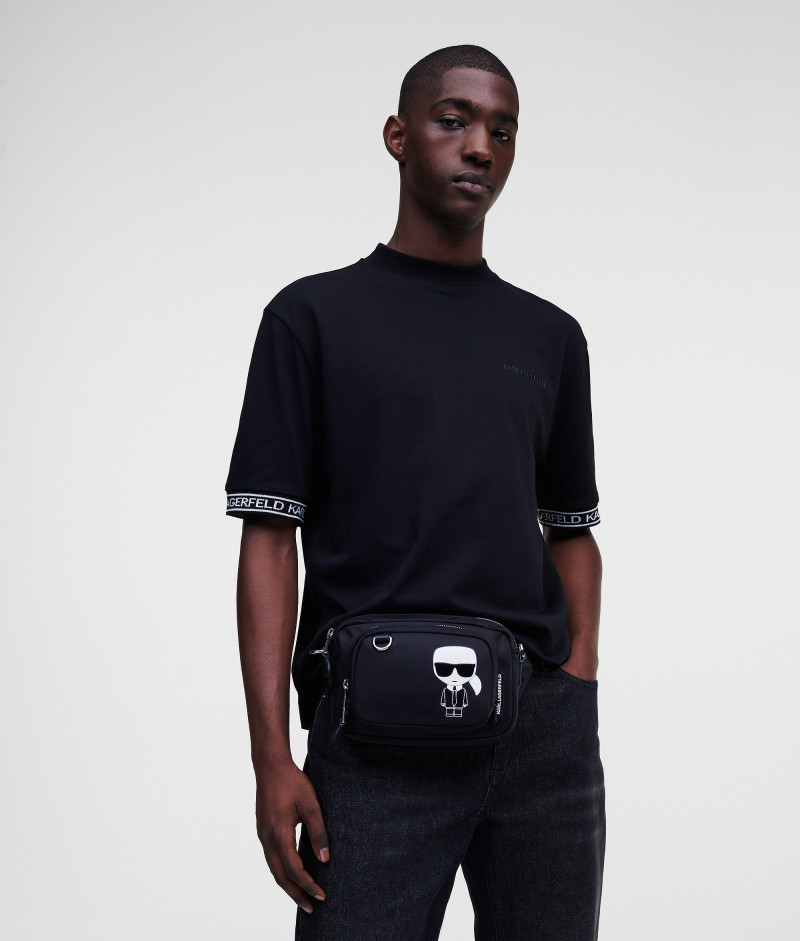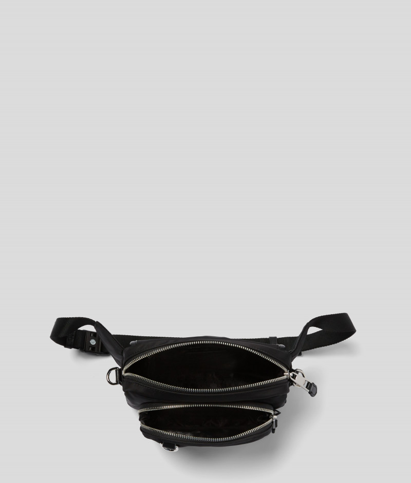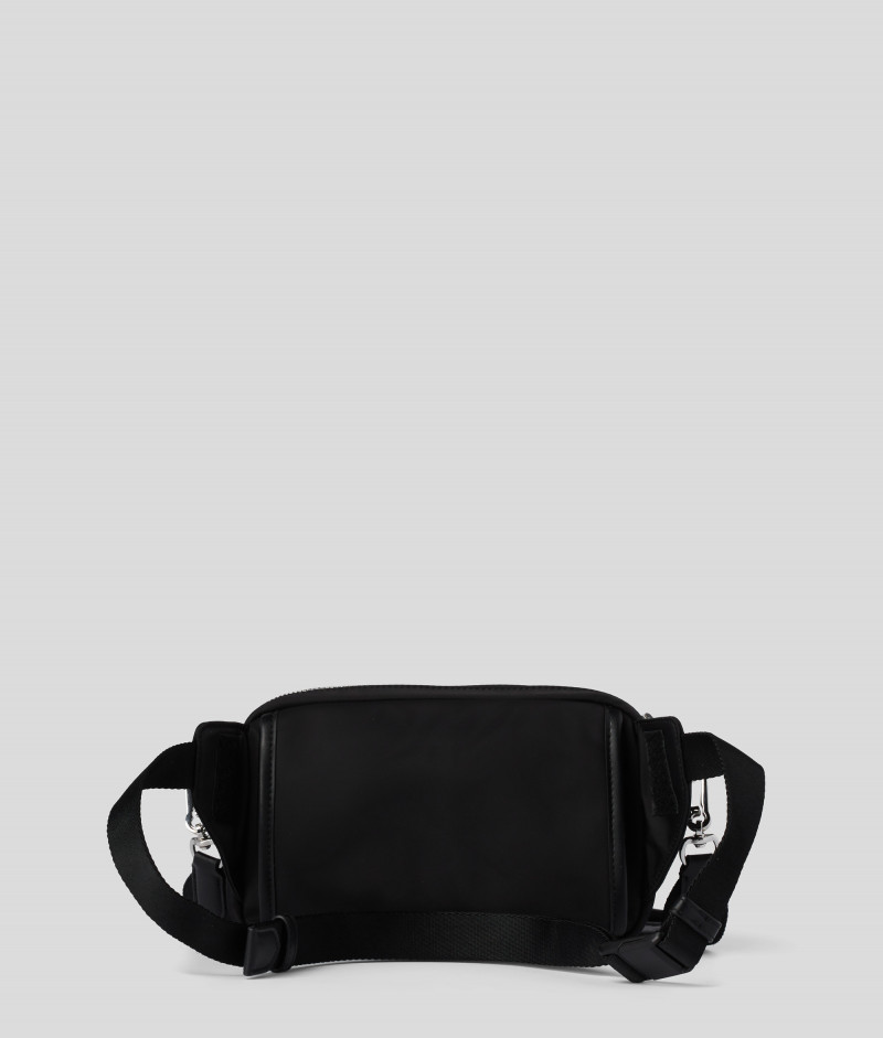 Ozvláštnite svoj outfit touto konvertibilnou crossbody kabelkou, ktorú je možné nosiť okolo pása. Táto taška je vyrobená z udržateľných materiálov a je vybavená bedrovým popruhom na nosenie v páse a snímateľným dlhým popruhom na nosenie cez rameno. Ležérny štýl dopĺňa hravá nášivka Ikonik Karl.