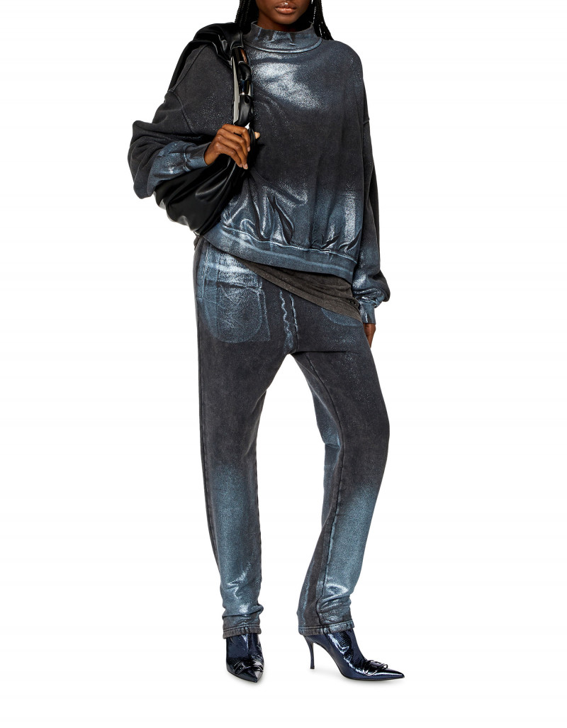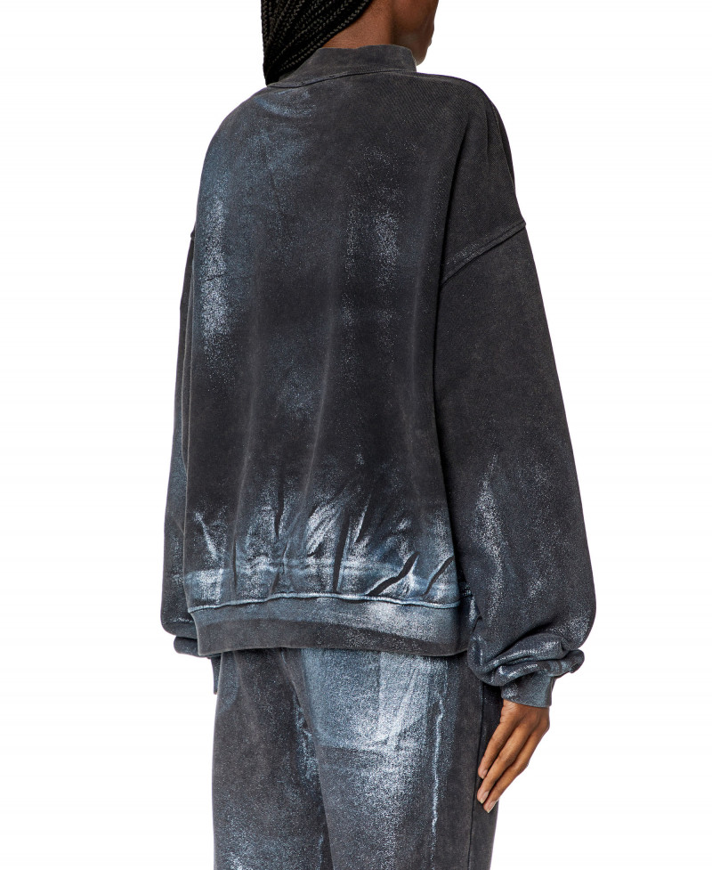 Dámska mikina bez kapucne voľného strihu so stojačikom. Tento kus bol špeciálne vypraný a potiahnutý kúskami metalickej fólie, výsledkom čoho je mramorovaný opotrebovaný vzhľad s trblietavým efektom. Vyrobená z bavlneného džerseja. Doplnená vyšívaným oválnym logom D na rukáve. Modelka má na sebe veľkosť S a meria 175 cm. Zodpovedá veľkosti, vezmite si svoju normálnu veľkosť.
