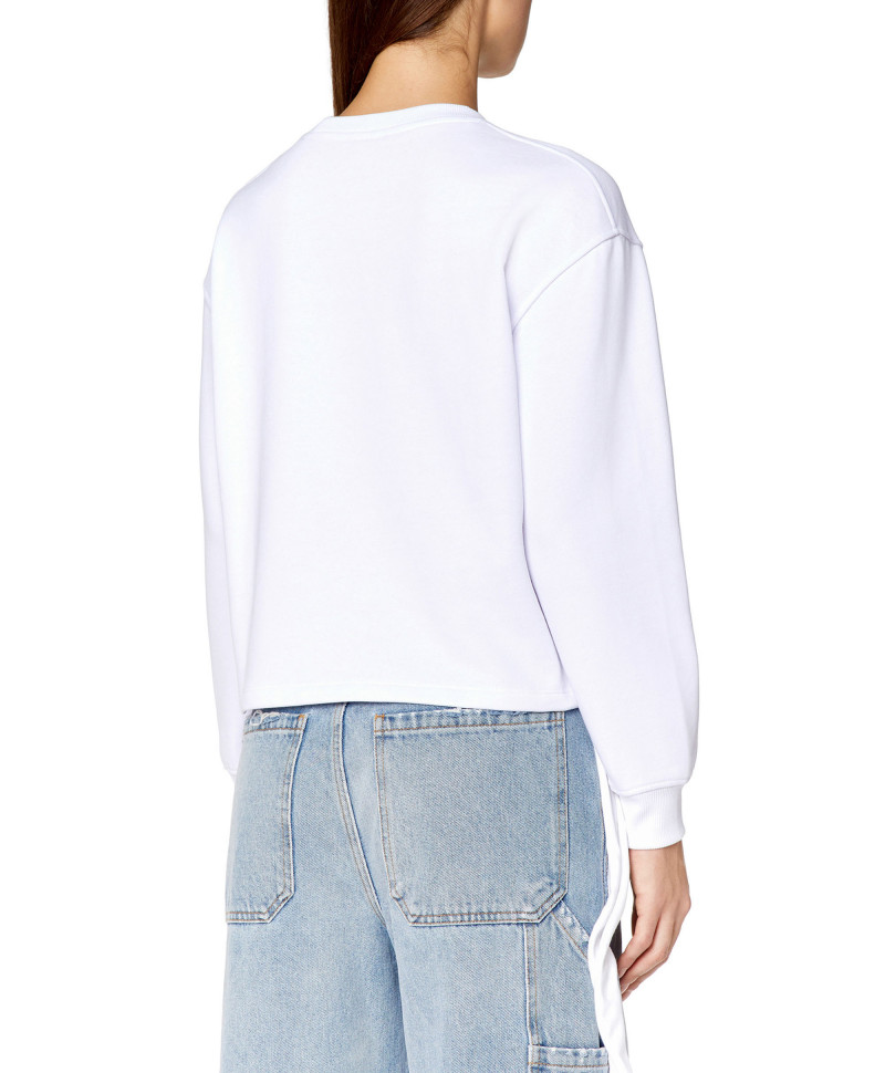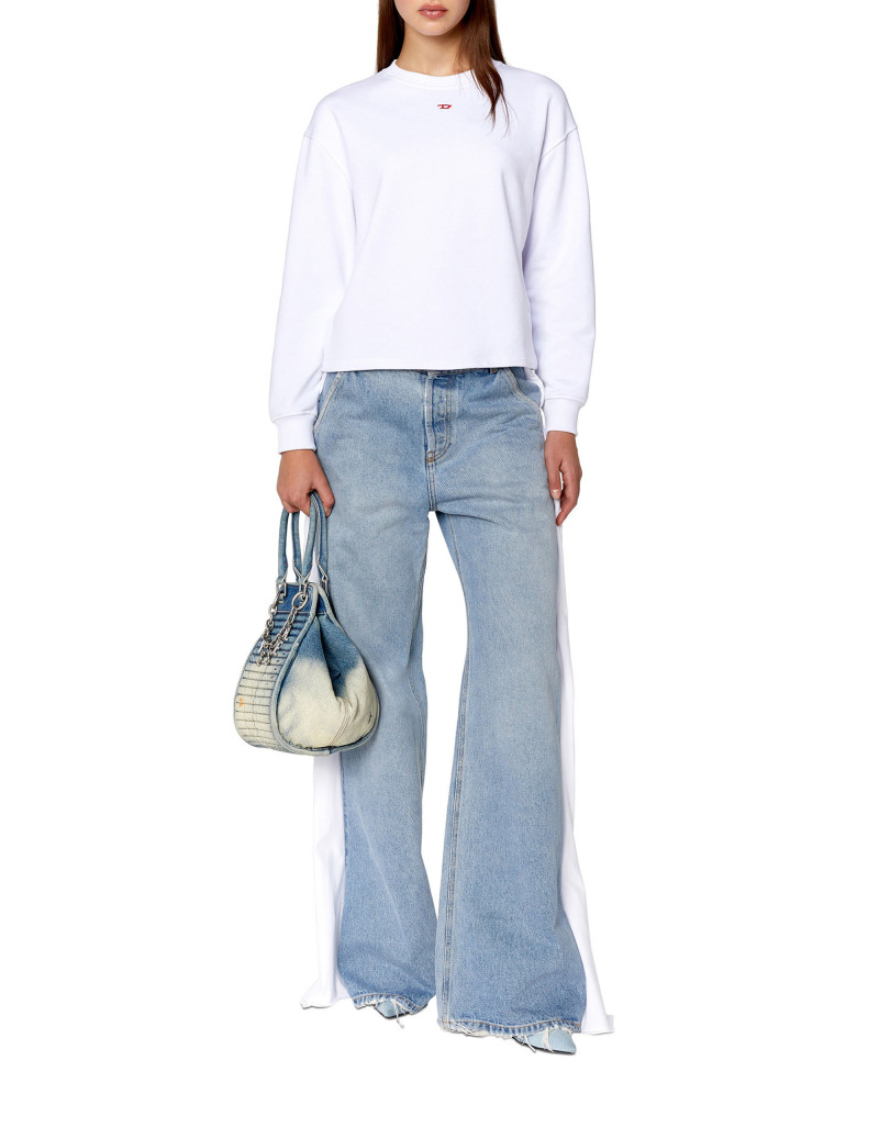 Dámska mikina s okrúhlym výstrihom. Navrhnutá v rovnej, voľnej siluete. Vyrobená z džerseja z organickej bavlny a recyklovaného polyesteru. Minimalistický dizajn tvorí detail nášivky s logom v tvare písmena "D" umiestneným v strede hrude. Rebrované lemovanie pri krku a manžetách. Veľkosti bývajú väčšie, pri výbere si vyberte o jednu veľkosť menšiu ako zvyčajne. Modelka má na sebe veľkosť S a je vysoká 175 cm.