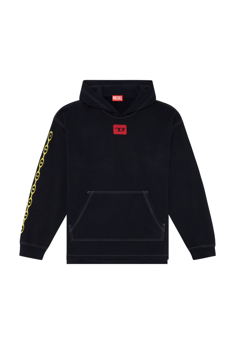 Pánska mikina s kapucňou uvoľneného strihu. Zdobí ju digitálne potlačená animáciami airbrush so špeciálnym vyblednutým vzhľadom. Kontrastne prešívaný dizajn spolu s klokaním vreckom je vyrobený z bavlneného džerseja a ozdobený červeným logom D a ikonickým logom For Successful Living na chrbte. Rukávy a spodný lem zakončené pružnými rebrovanými manžetami. Model má na sebe veľkosť L a meria 182 cm. Zodpovedá veľkosti, vezmite si svoju normálnu veľkosť.