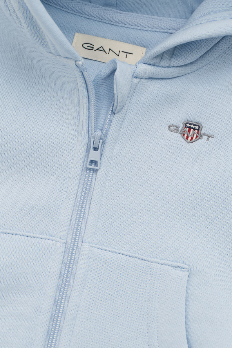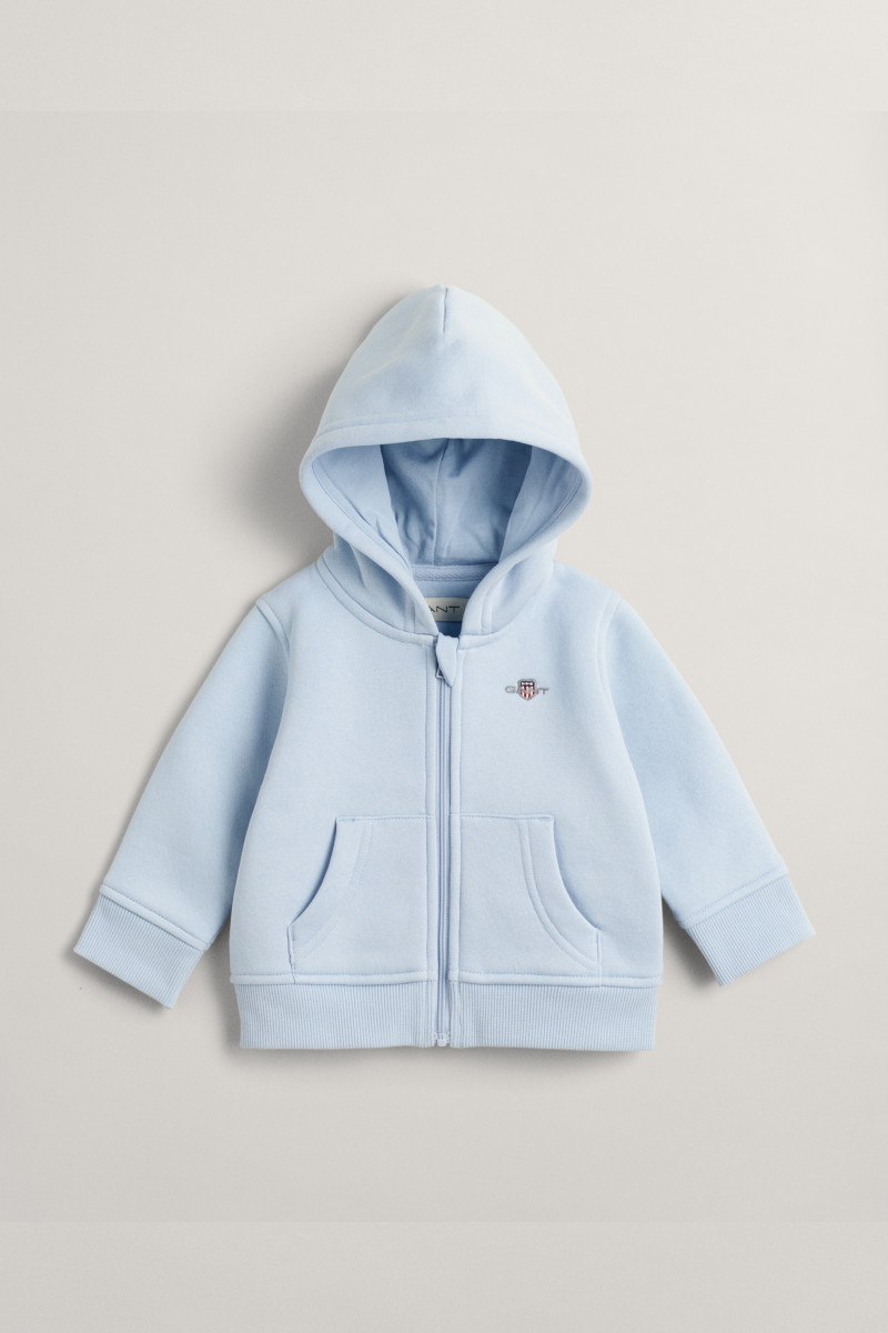 Detská celozapínacia mikina na zips s kapucňou. Praktické zakončenie rovného strihu rebrovaným nápletom v páse aj okolo zápästia. Ikonické Gant logo vyšité na hrudi dopĺňajú dve bočné šikmé vrecká. Materiálové zloženie je tvorené vysokým podielom bavlneného vlákna organického pôvodu, ktoré vyniká svojou zamatovou hebkosťou, jedinečnou priedušnosťou, avšak príjemnou hrejivosťou. Prémiový džersej je zárukou pohodlia a spokojnosti, ktoré je pre každé bábätko zásadné. Unikátneho voľnočasového outfitu docielite kombináciou s tepláčikmi v rovnakom dizajne.