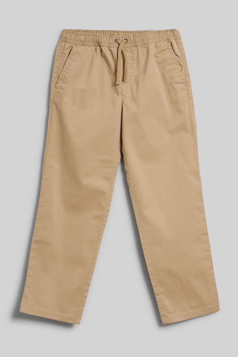 Detské nohavice s pružným pásom, ktorý má po obvode vnútornej strany všitú šnúrku pre prípadné stiahnutie. Voľný strih nohavíc, klasická výška sedu. Dve šikmé bočné a dve zadné výpustkové vrecká. Materiálové zloženie tvorí ľahká, elegantne splývavá tkanina z bavlneného vlákna prémiovej kvality, ktoré je na dotyk príjemne mäkké. Prímes elastanu je zárukou pružnosti a zároveň tvarovej stálosti. Vysoko komfortný kúsok, ktorý predstavuje vkusnú alternatívu športových úpletových nohavíc.