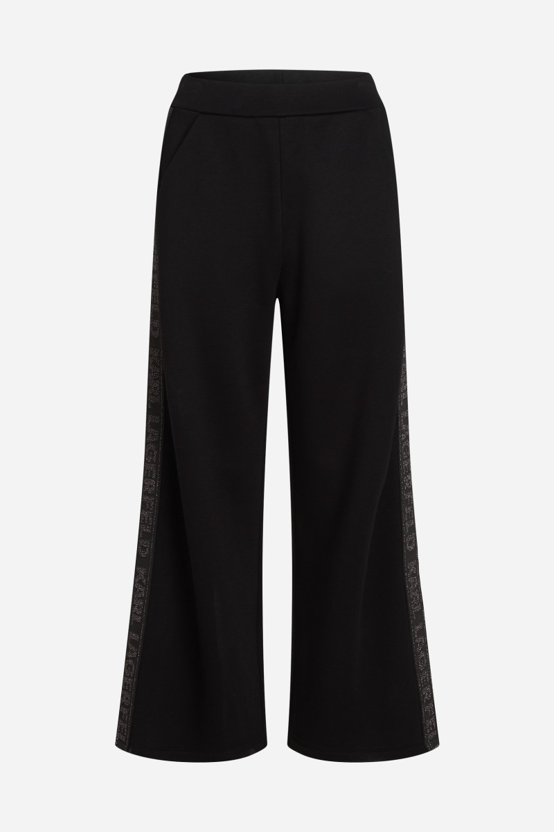 Dámske nohavice s pružným pásom. Voľný strih so širokými nohavicami a mierne skrátenou dĺžkou dopĺňajú nenápadné vrecká v bočnom šve. Sú zdobené trblietavou páskou s logom Karl pozdĺž vonkajšej strany na nohaviciach. Materiálové zloženie zaručuje dokonalú pružnosť, ľahkosť a veľmi príjemný pocit pri nosení. Výborne kombinovateľný kúsok, ktorý štýlovo doladí Váš športovo-elegantný aj formálny outfit.