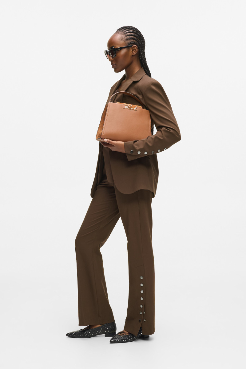 Dámske nohavice s dlhými úzkymi nohavicami, ktoré sa od kolien smerom dolu mierne rozširujú. Jednofarebný dizajn so stredne vysokým pásom, skrytým zapínaním a bočnými klínovými vreckami dopĺňa zaujímavý detail v podobe rozopínateľných gombíkov po boku nohavíc a dve zadné výpustkové vrecká s vyšívaným Karl Autograph logom. Materiálové zloženie zaručuje dokonalú pružnosť, ľahkosť a veľmi príjemný pocit pri nosení. Výborne kombinovateľný kúsok, ktorý štýlovo doladí Váš športovo-elegantný aj formálny outfit.