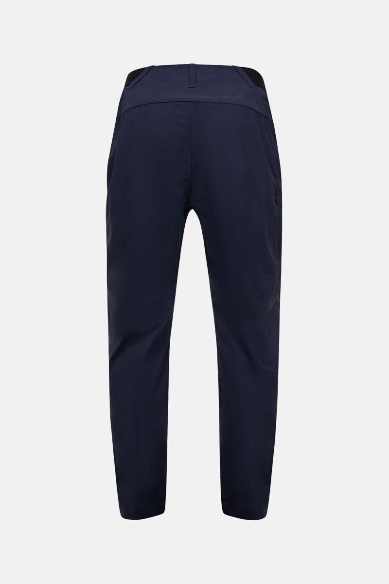 Dámske cyklistické nohavice. Rovný strih nohavíc so zužujúcimi sa nohavicami s vyšším zadným strihom s elastickým pásom a voľnejším strihom na stehnách a vytvarovanými kolenami je prispôsobený špeciálne na používanie na bicykli. Okrem bočných vreciek na zips a na nohavici, brand štítku na boku a potlači loga vpredu sú nohavice vybavené ďalšími funkčnými prvkami, ako je skrytá reflexná páska v spodnom leme, ktorú možno ohnúť nahor alebo nadol. Sú vyrobené z pružnej, vodoodpudzujúcej a skladnej nylonovej zmesi bez PFAS. Veľmi praktický kúsok pre celoročné využitie, ktorý okrem cyklistiky využijete aj na iné outdoorové aktivity.