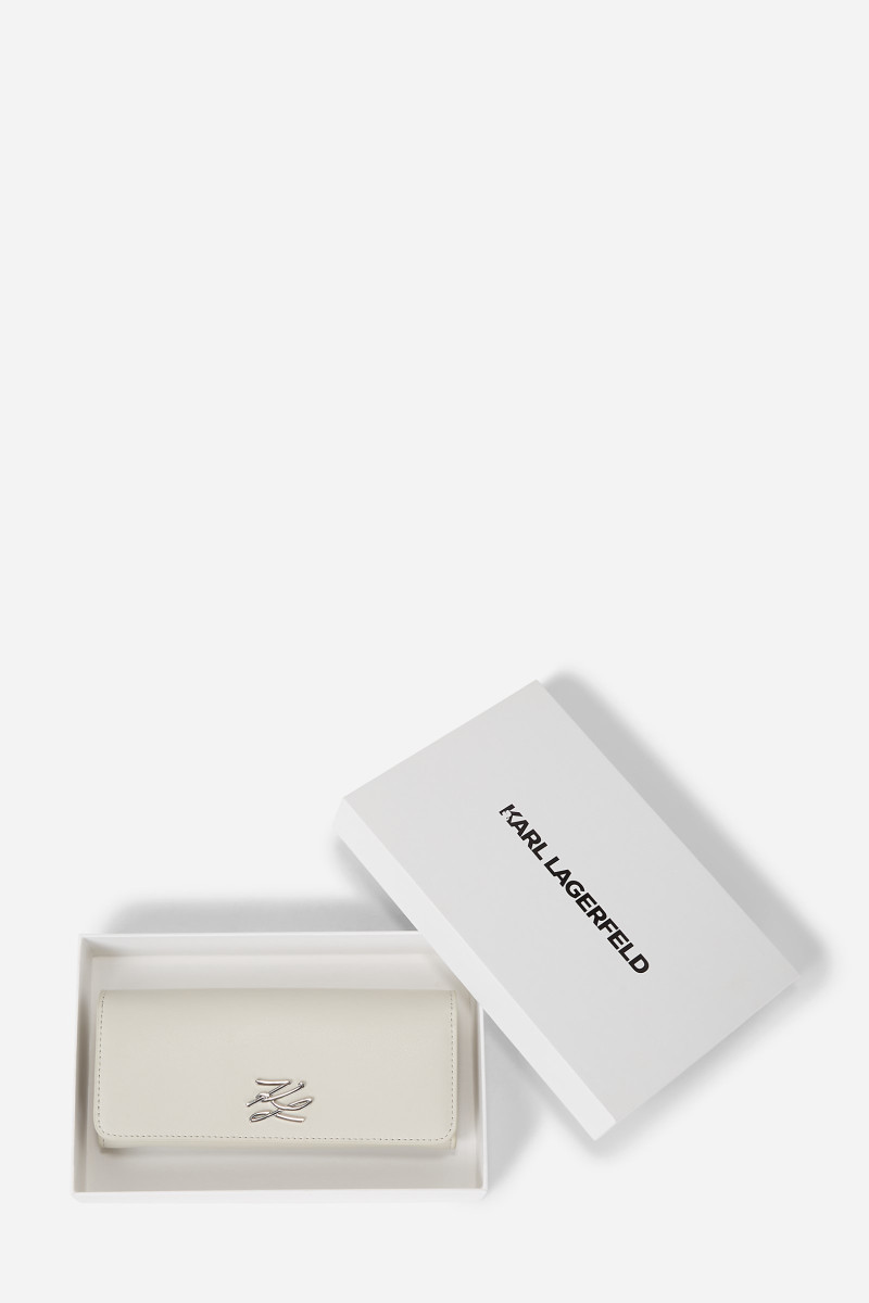 Dámska peňaženka z hladkej hovädzej usne prémiovej kvality, ktorú zdobí kovové logo Karl Autograph v nápaditej striebornej farbe umiestnené na chlopni. Elegantný dizajn obdĺžnikového tvaru s uzatváraním na magnetickú chlopňu dopĺňa vnútorné vrecko na mince vybavené zipsom a niekoľko priehradok na karty a bankovky. Originálny darček aj nezameniteľne štýlový doplnok pre všetkých milovníkov značky Karl Lagerfeld.