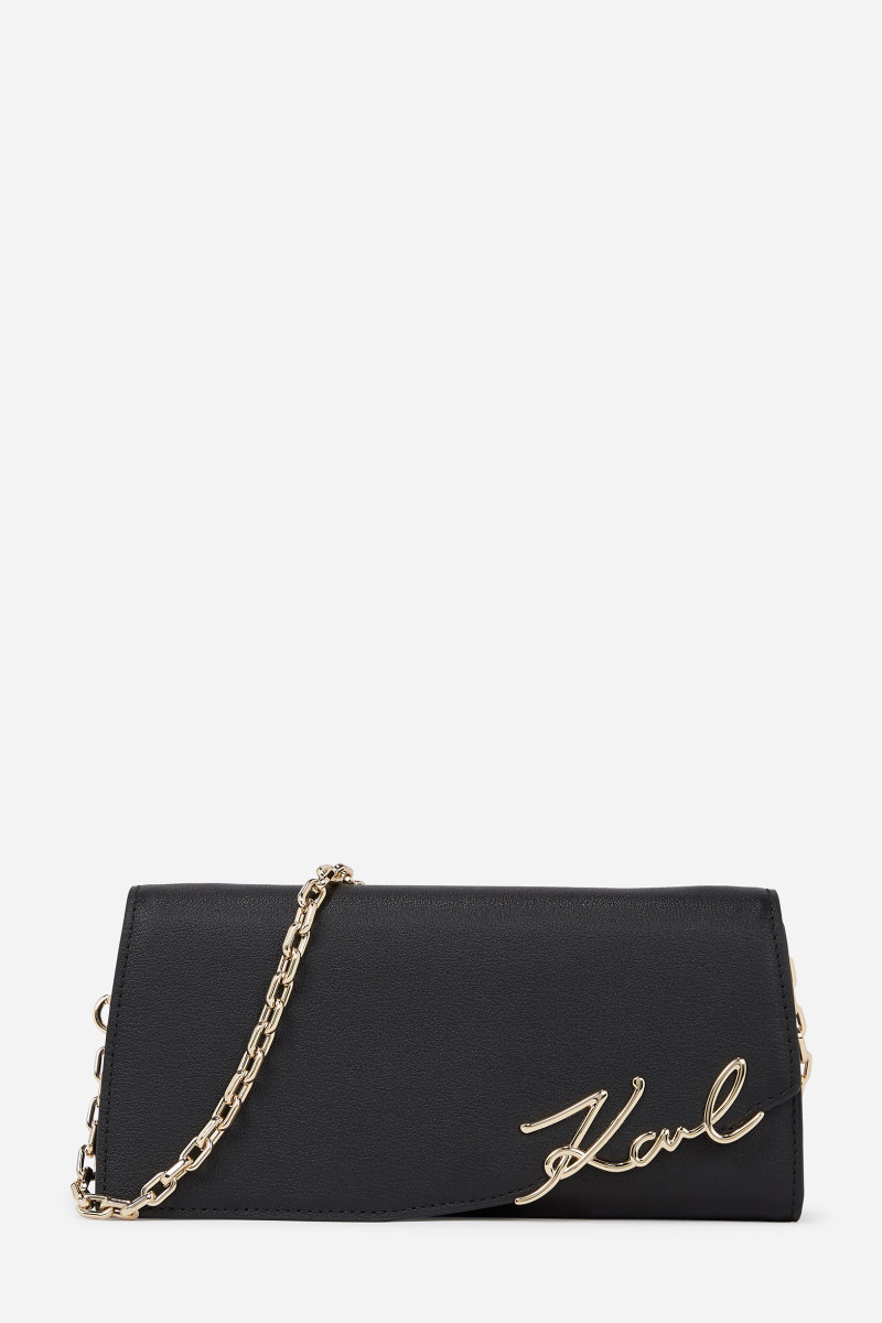 Dámska viacúčelová peňaženka z hladkej hovädzej usne prémiovej kvality. Elegantný štíhly dizajn s odnímateľným retiazkovým popruhom cez rameno dopĺňa klopa na zapínanie zdobená zlatým logom K/Signature. Interiér je vybavený vreckom na mince so zipsom, niekoľkými priehradkami na karty a vreckom na bankovky a ostatné účty. Nezameniteľne štýlový doplnok, ktorý doladí Váš outfit k dokonalosti.