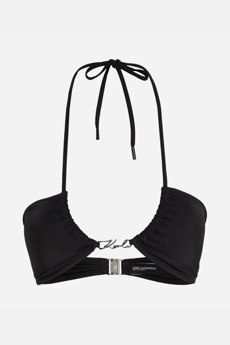 Dámsky vysoko lesklý džersejový vrchný diel plaviek s košíčkami v tvare bandeau s odnímateľnými vypchávkami. KARL Signature dodáva luxusný nádych, zatiaľ čo ohlávka na krk a zapínanie na sponu zaisťujú bezpečné uchytenie. Zlaďte tie svoje s ladiacimi nohavičkami bikín pre dokonalý komplet.