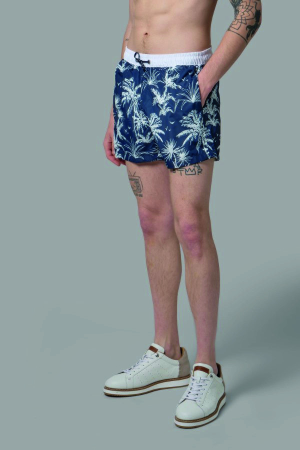 Pánske kúpacie šortky v klasickom kratšom strihu so sezónnou potlačou, zadným vreckom a sťahovacím pásom na šnúrky.