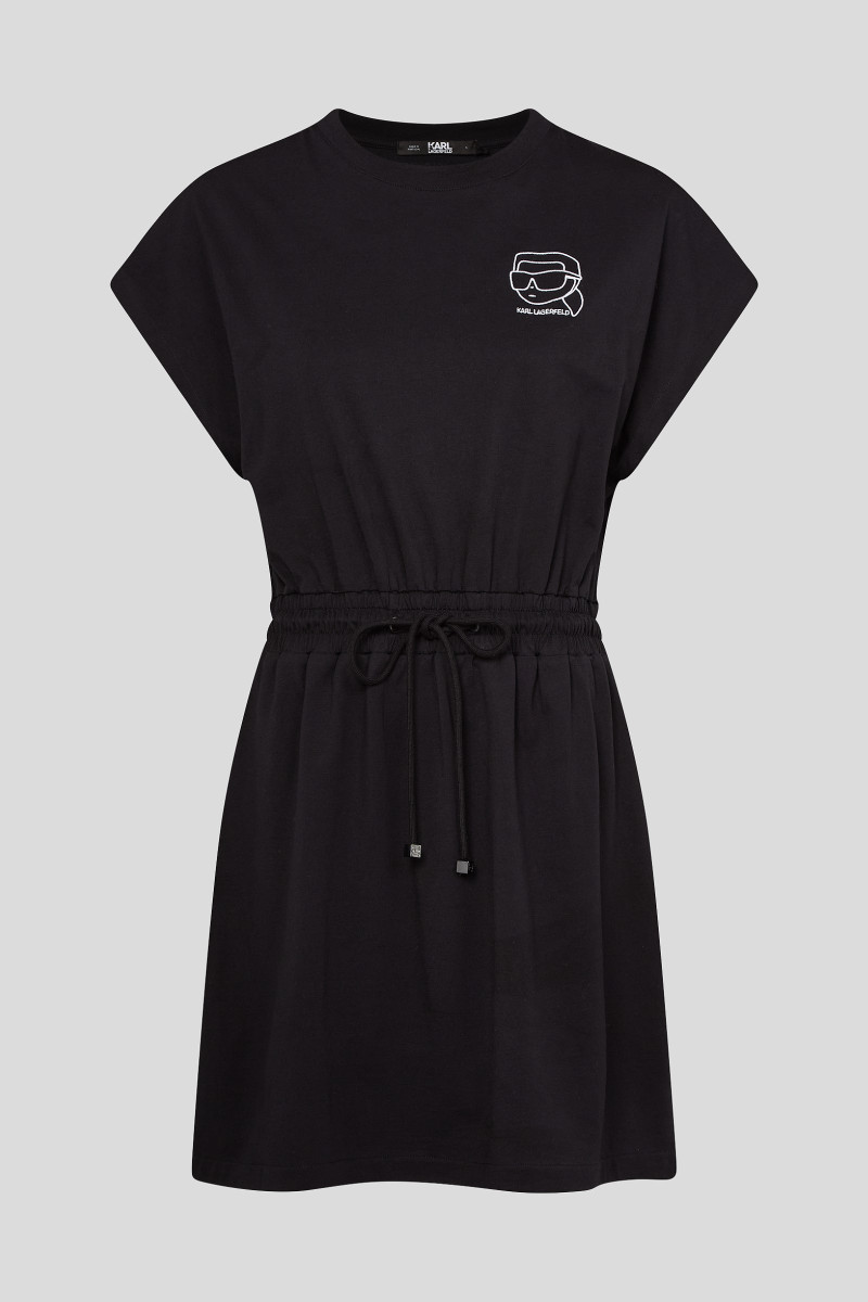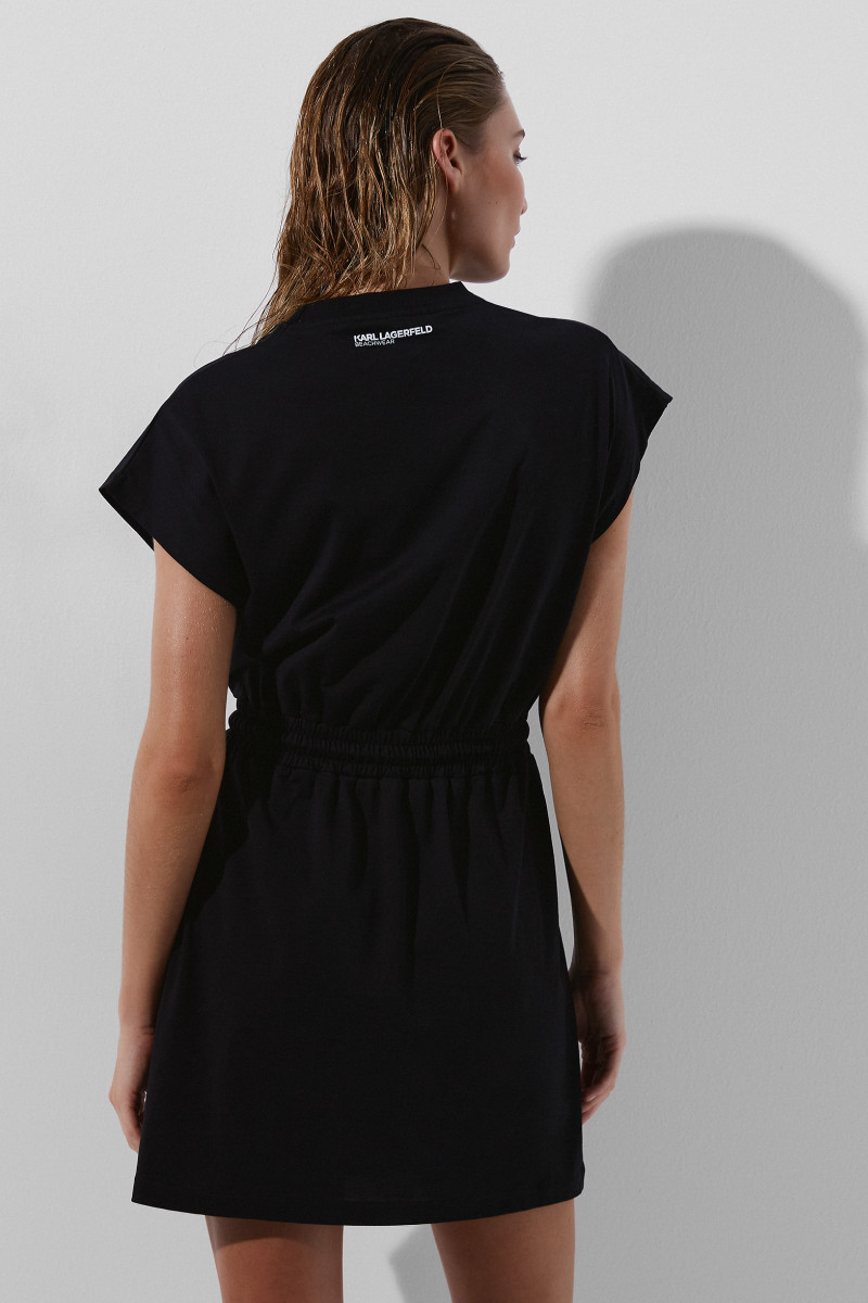 Ležérne plážové šaty z novej kolekcie Ikonik 2.0. Tieto mimoriadne pohodlné šaty z bio bavlny majú v páse šnúrku na stiahnutie zdobenú hravými korálkami na grafike Ikonik a na hrudi majú modernizovanú nášivku Ikonik Karl.