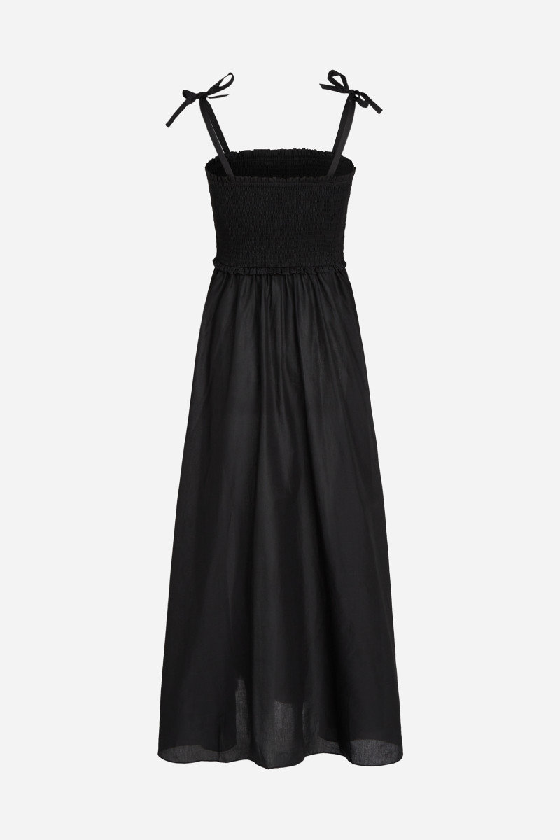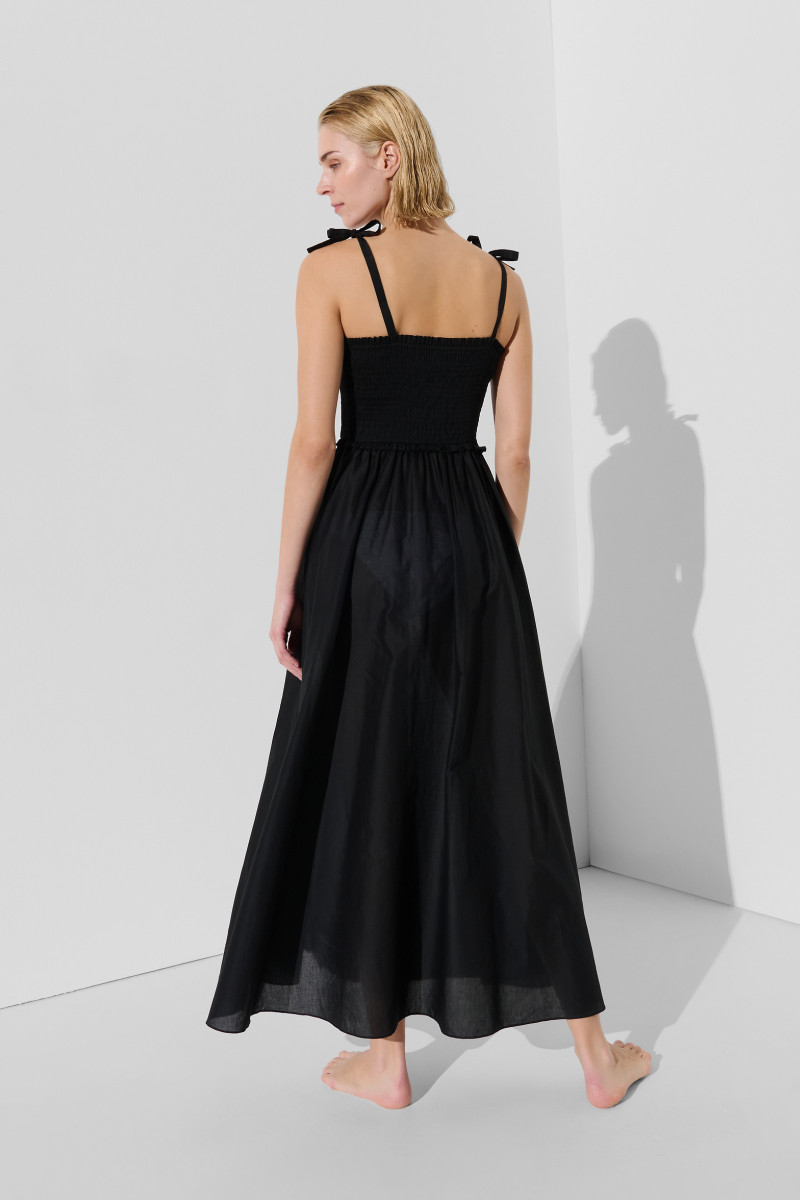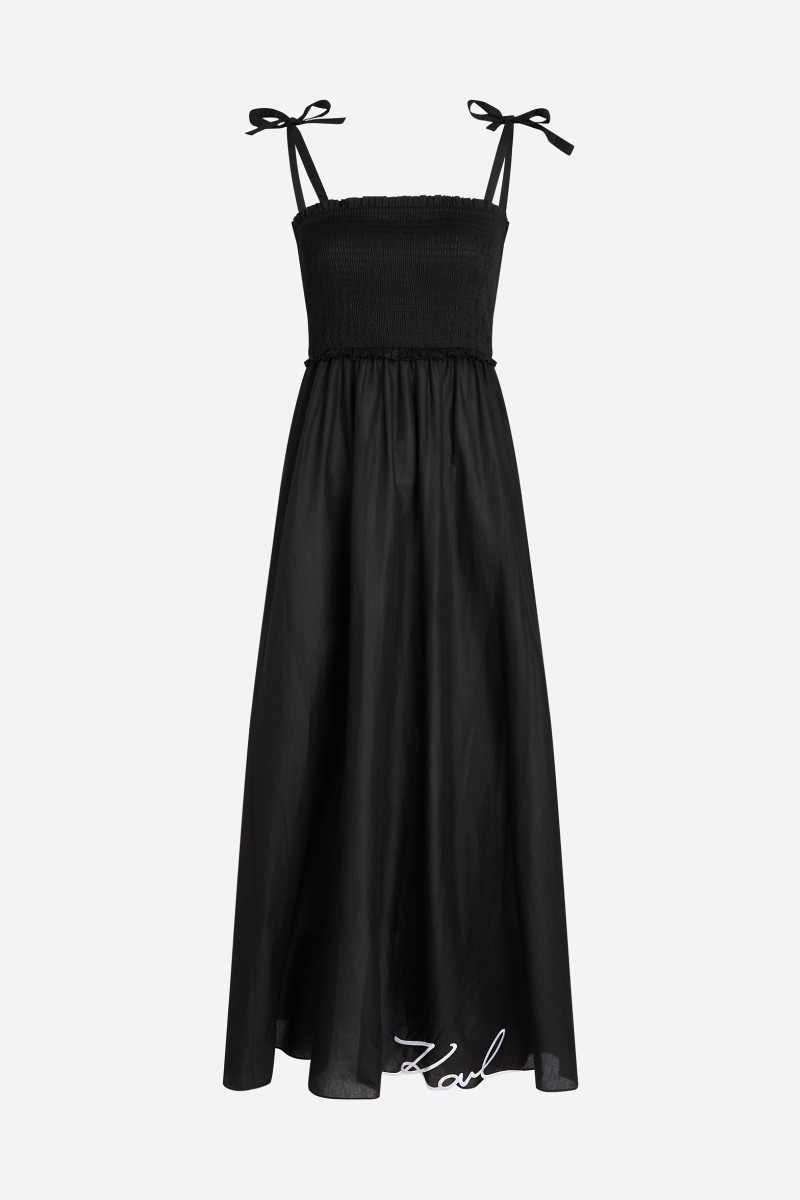 Dámske elegantné šaty bez rukávov v dĺžke po členky. Romantický dizajn s úzkym strihom na hrudi dotvoreným jemnými samozaväzovacími ramienkami dopĺňa plná sukňa do áčkového strihu. Kontrastné Karl Signature logo umiestnené na spodnom leme dodáva šatám moderný nádych. Materiálové zloženie je tvorené jemnou, avšak odolnou tkaninou z bavlneného vlákna prémiovej kvality, ktoré je zárukou priedušnosti a príjemnej mäkkosti. Vysoko komfortný kúsok, ktorý si vďaka svojim prvotriednym vlastnostiam a všestrannej kombinovateľnosti zamilujete.