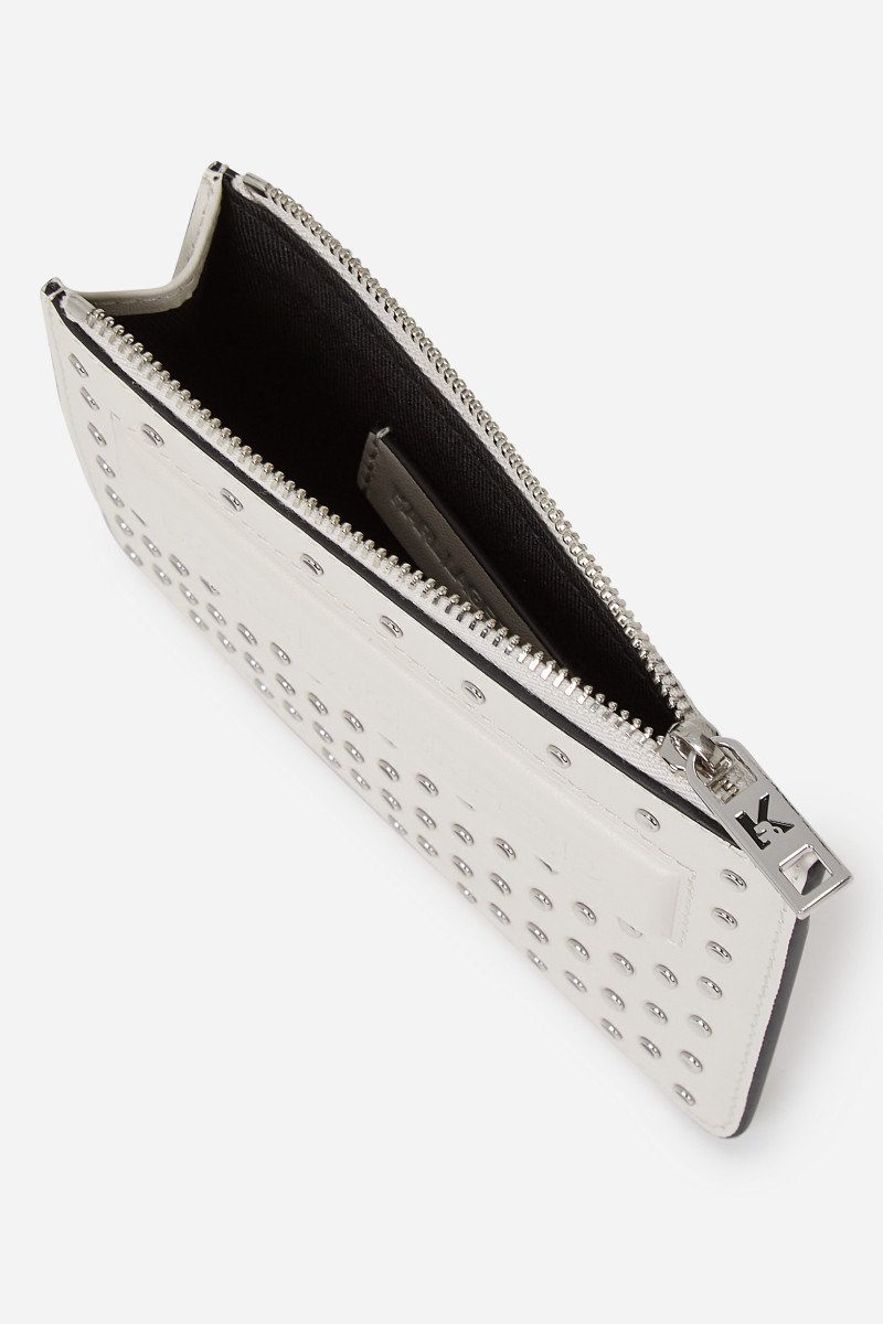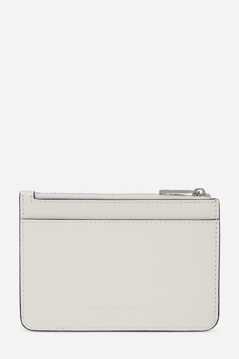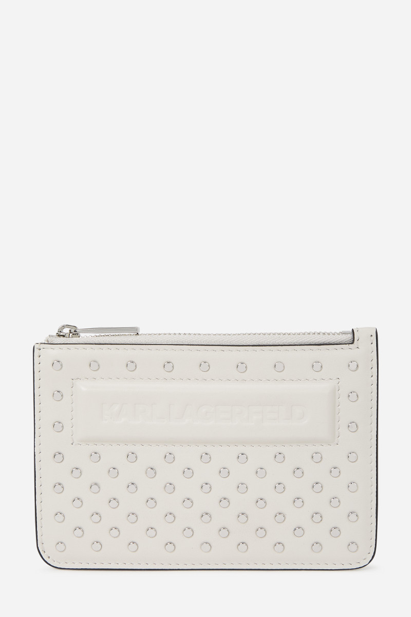 Dámske púzdro na platobné karty z hladkej hovädzej usne prémiovej kvality, ktorú zdobí výrazné zdobenie s cvočkami a logom Karl Lagerfeld umiestnené na prednej strane. Puzdro obsahuje priehradku na karty vzadu a vrchné vrecko so zapínaním na zips v strede. Materiálové zloženie je tvorené hovädzou kožou, ktorá vyniká svojou extrémnou pevnosťou a odolnosťou, zároveň však príjemnou mäkkosťou. Originálny darček aj nezameniteľne štýlový doplnok pre všetkých milovníkov značky Karl Lagerfeld.