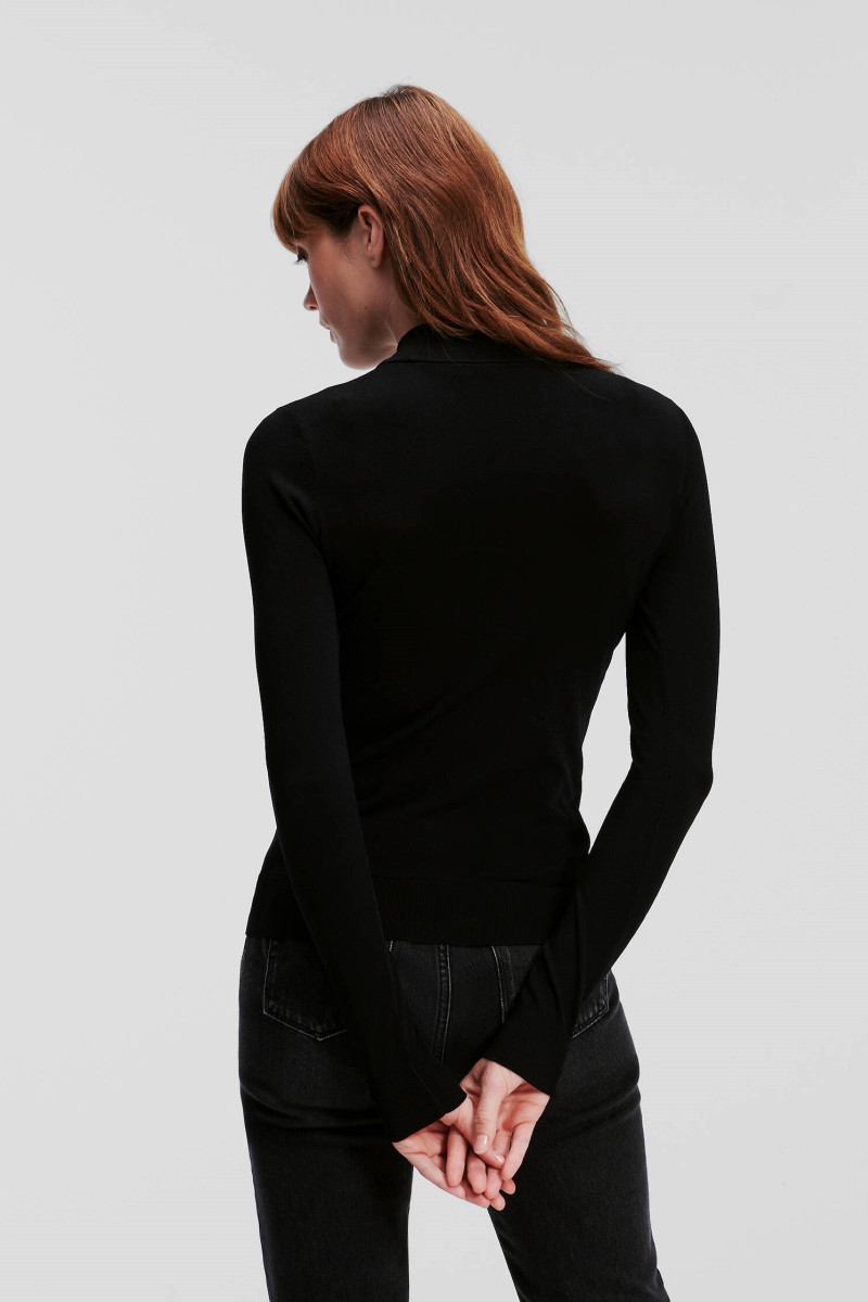 Minimalistický sveter s roláčikom ozdobený jemnou výšivkou KARL. Je ušitý z mimoriadne mäkkej zmesi viskózy, má zoštíhľujúcu siluetu a dokonale sa hodí na vrstvenie.