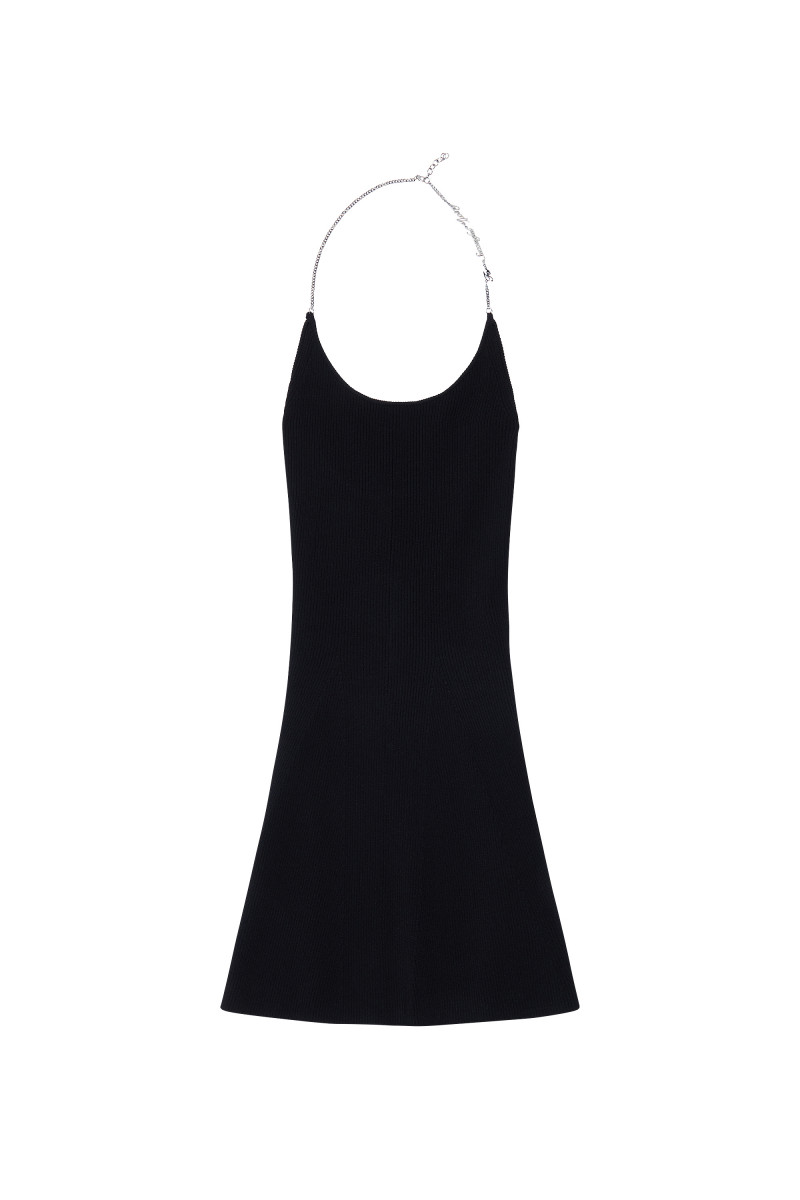 Dámske krátke čierne šaty. Slim fit užší strih s mierne rozširujúcim sa lemom a otvoreným chrbtom. Originálny retiazkový halterneck tvorený sloganom spoločnosti: Diesel For Successful Living. Vyrobené z rebrovaného strečového úpletu. Modelka má na sebe veľkosť S a meria 175 cm.