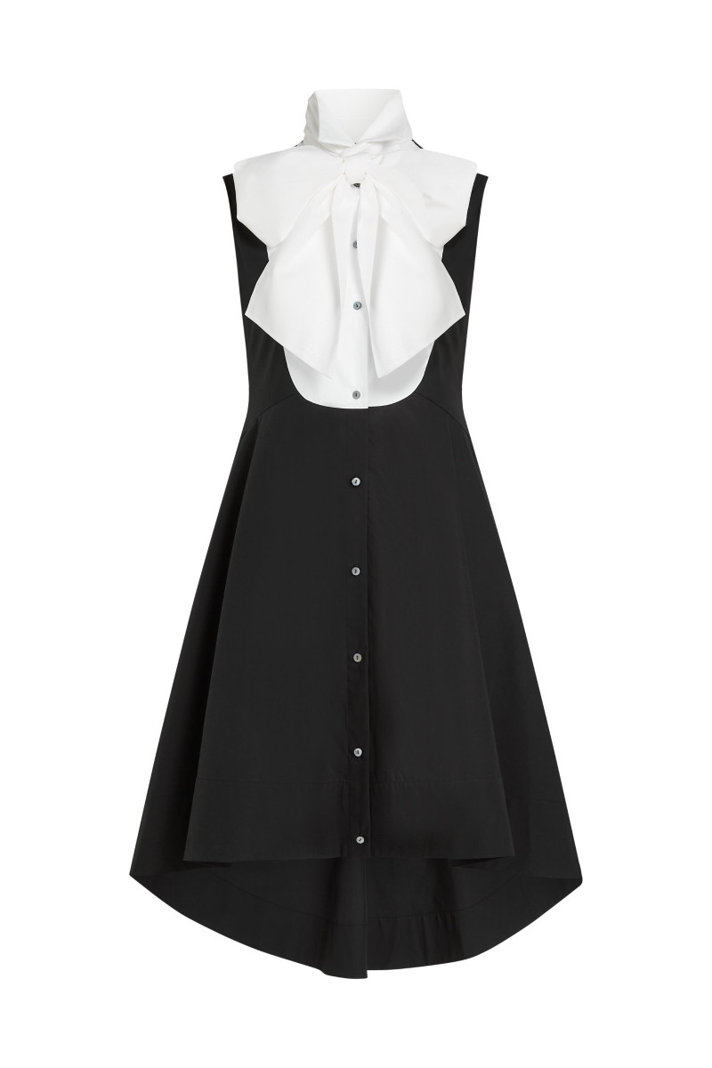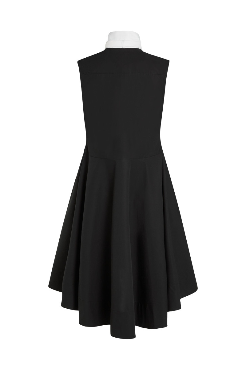 Dámske šaty bez rukávov s mimoriadne lichotivým strihom. Jednofarebný dizajn v asymetrickej dĺžke zdobený kontrastným bielym detailom náprsníka vpredu s nadrozmernou mašľou. Sukňa do áčkového strihu dopĺňa zapínanie na gambíky v zadnej časti. Materiálové zloženie je tvorené bavlneným vláknom prémiovej kvality, ktoré je zárukou pohodlného nosenia a príjemnej mäkkosti. Vysoko komfortný kúsok, ktorý si vďaka svojim prvotriednym vlastnostiam a všestrannej kombinovateľnosti zamilujete.