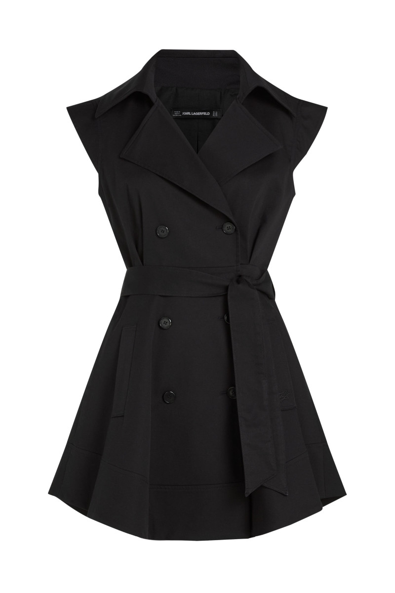 Dámske mini šaty v trenčkotovom dizajne bez rukávov. Dvojradová silueta s dvojradovým zapínaním, charakteristickými klopami dopĺňajú praktické bočné vrecká a sťahujúci pás s objemnou sukňou pre ženské tvarovanie. Pohodlné šaty v kvalitnom materiálovom zložení z pohodlnej bavlny zaručuje dokonalú splývavosť, ľahkosť a maximálne príjemný pocit pri nosení. Navrhnuté v spolupráci s ambasádorkou udržateľnosti, modelkou a aktivistkou Amber Valletta. Žensky veľmi rafinovaný kúsok, ktorý štýlovo oživí Váš letný šatník.