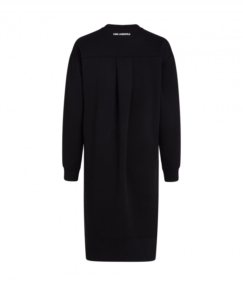 Dámske mikinové šaty, ktoré zdobí pôsobivá štrukturálna potlač na hrudi v podobe kruhového loga KARL. Uvoľnený dizajn s okrúhlym výstrihom a nenápadnými bočnými vreckami dopĺňa decentný nápis brandu umiestnený na zadnom diele. Nechýba zámik na chrbte a rozparky na boku pre väčšiu voľnosť pohybu. 100% organická bavlna je zárukou maximálnej priedušnosti, pohodlia a jednoduchej údržby. Výborne kombinovateľný kúsok, ktorý štýlovo doladí váš ležérny outfit.