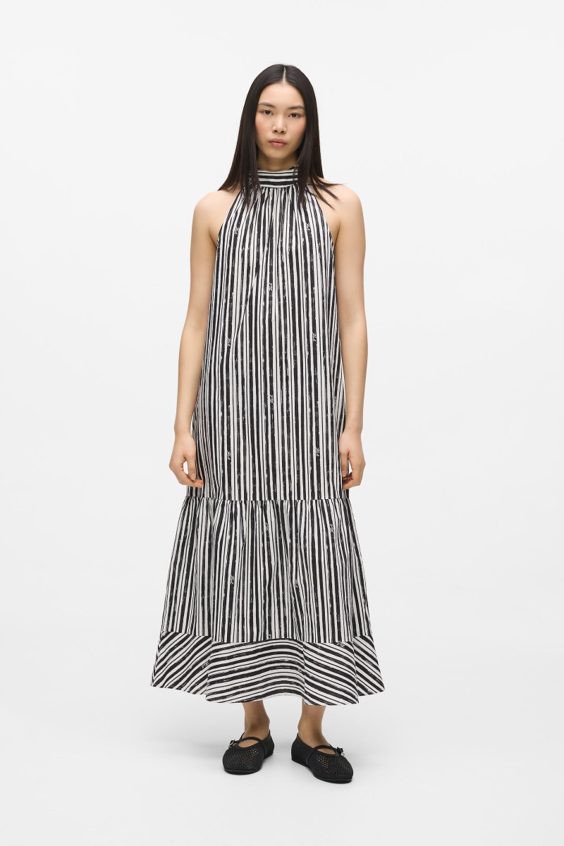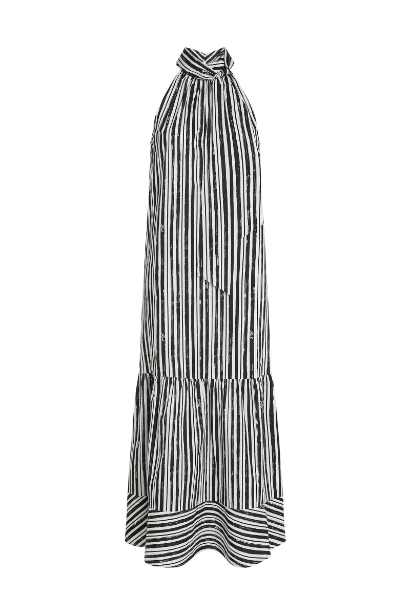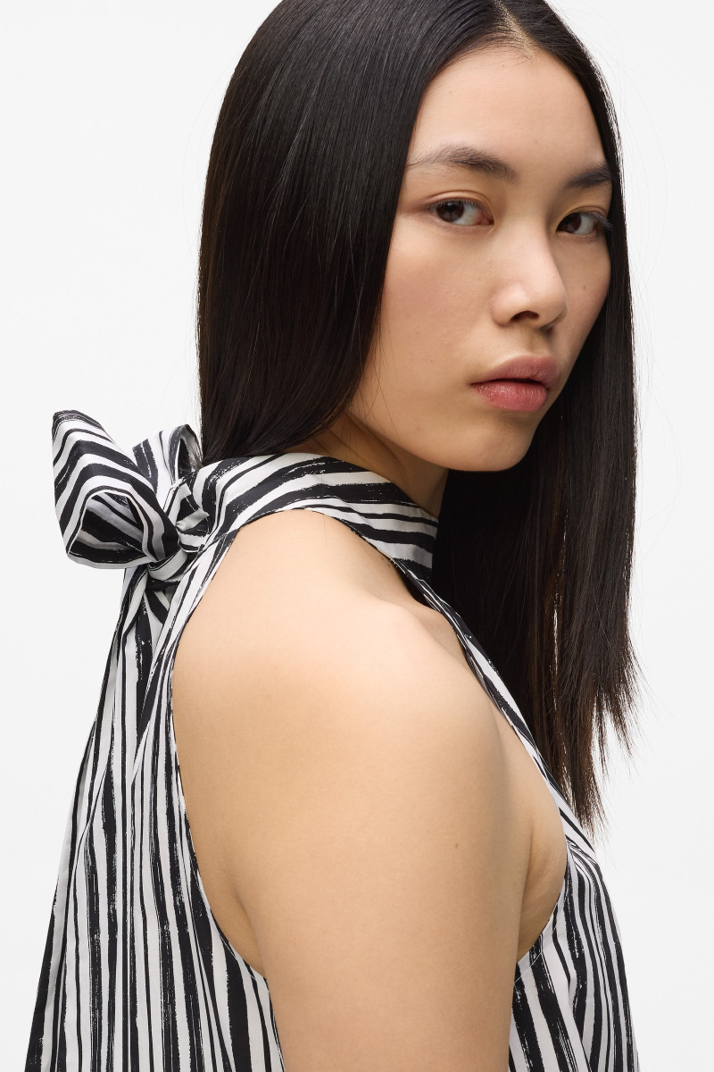 Dámske šaty bez rukávov s elegantným stojačikom, ktorý má vzadu na krku zapínanie na mašľu. Voľný, splývavý strih v maxi dĺžke necháva vyniknúť kvalitnému pôvodu ľahkej tkaniny, ktorú zdobí jedinečný pruhovaný vzor. Prémiová bavlnená tkanina zaručuje dokonalú priedušnosť a príjemný pocit pri nosení. Veľmi štýlový kúsok, ktorý bude ozdobou Vášho športovo-elegantného outfitu.