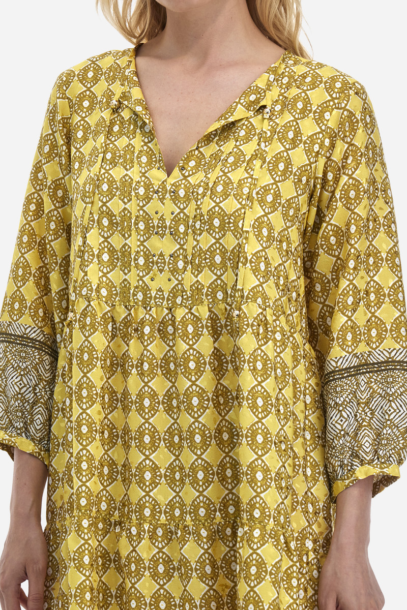 Dámske šaty voľného strihu s dĺžkou riasenej sukne pod kolená. 3/4 rukávy ukončuje jemné dvojité lemovanie. Prešívaná vrchná časť zjemňuje hlbší V výstrih možnosťou uviazania šnúrok na mašličku. Prvotriedne spracovanie a kvalitný materiál tvorený 100% viskózou. Šaty sú priedušné, na dotyk príjemné a veľmi pohodlné. Veľmi nápaditý kúsok v modernom strihu, ktorý dokonale osvieži Váš letný šatník.