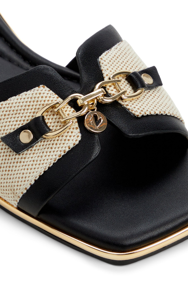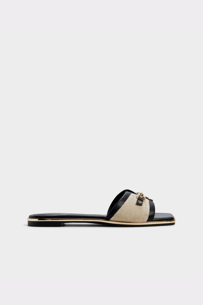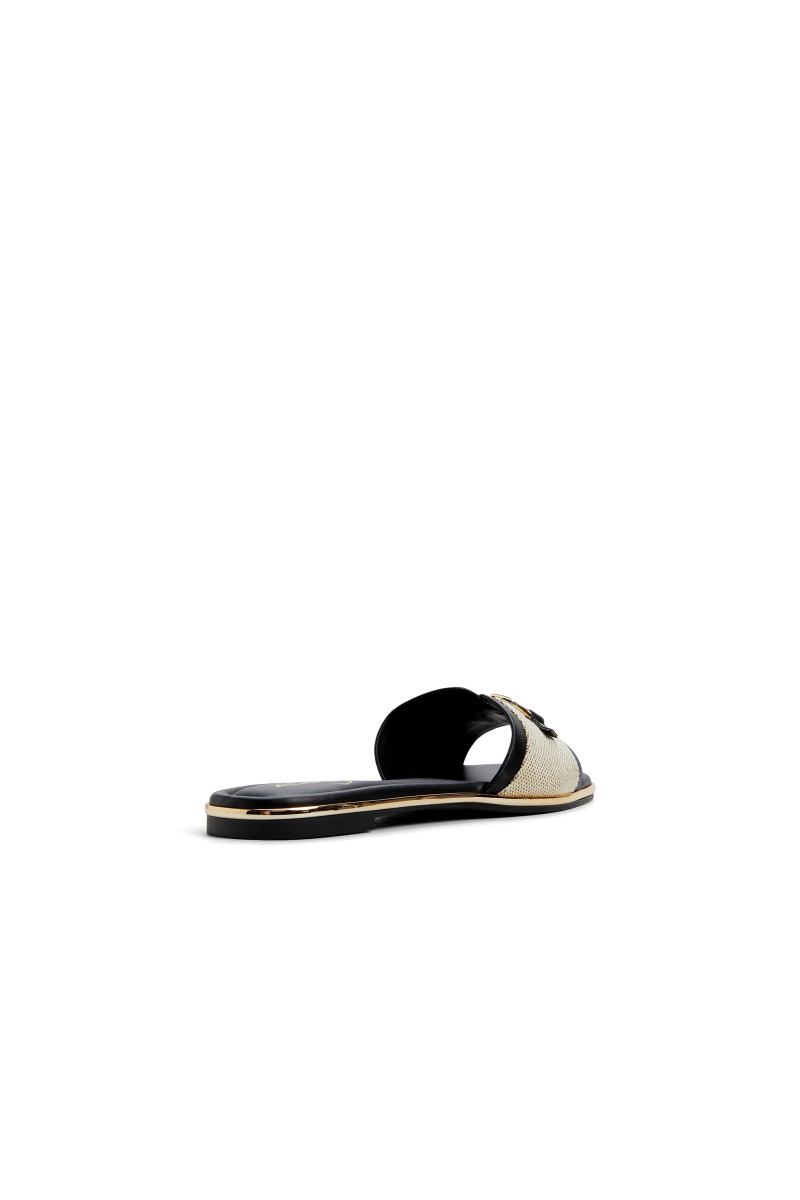 Hrubo jemná textúra chrumkavej kože zdobí ľahké tkané šnúrky a žiarivú zlatú pracku s logom, čím premení nenáročné šľapky na výrazný doplnok, ktorý môžete nosiť od bazéna až po mestské uličky. Kombinujte s ľanovými šortkami na prechádzky po trhu alebo si ich obujte k saténovému overalu na drinky na streche, ktoré prejdú v nočné mestské svetlá.