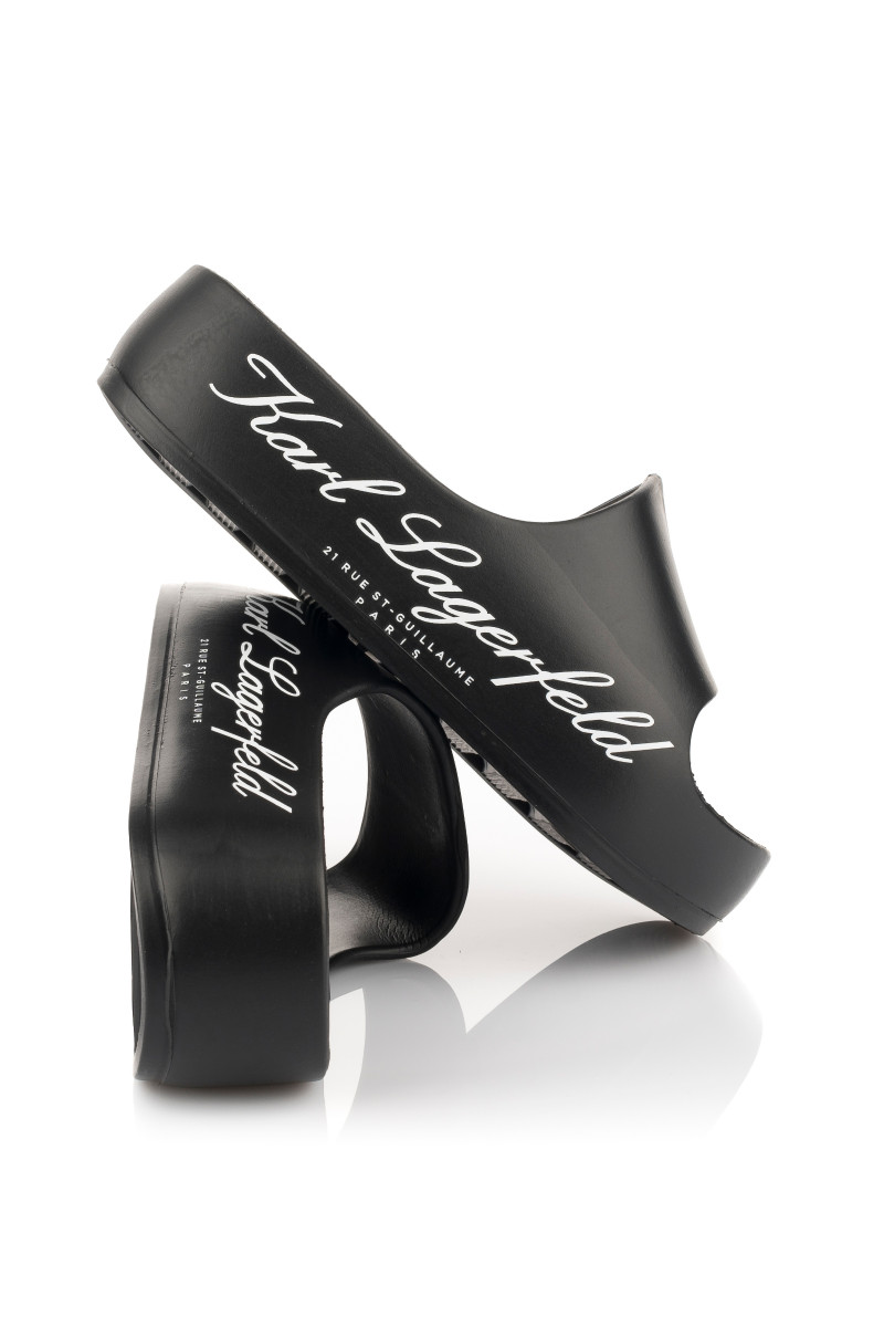 Dámske šľapky s otvorenou špičkou. Ľahký a flexibilný syntetický materiál s ergonomicky tvarovanou stielkou zaručuje maximálne pohodlie a príjemný pocit pri nosení. Ikonická čierno-biela kombinácia s kontrastným logom KARL LAGERFELD umiestneným na vonkajšej strane vysokej podrážky dodáva topánke originalitu a vtip. Nezameniteľne štýlová obuv, ktorá vám spríjemní horúce letné dni.