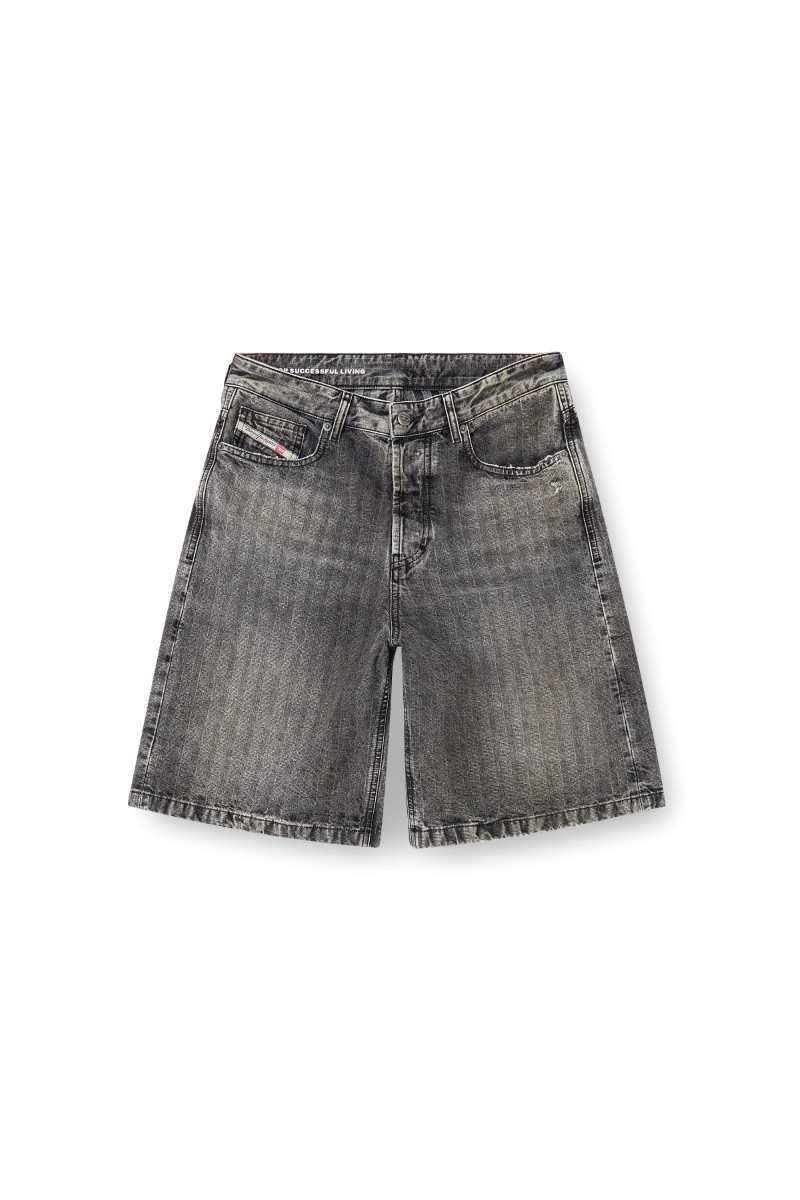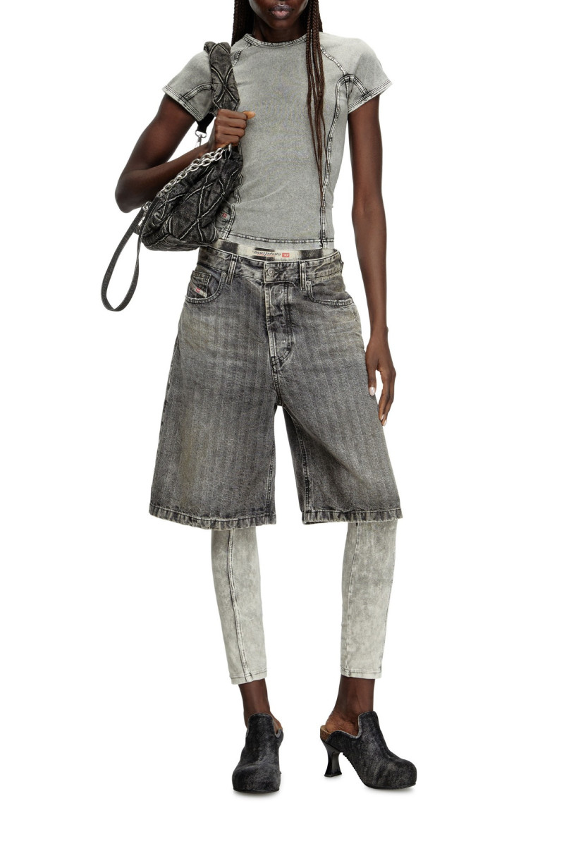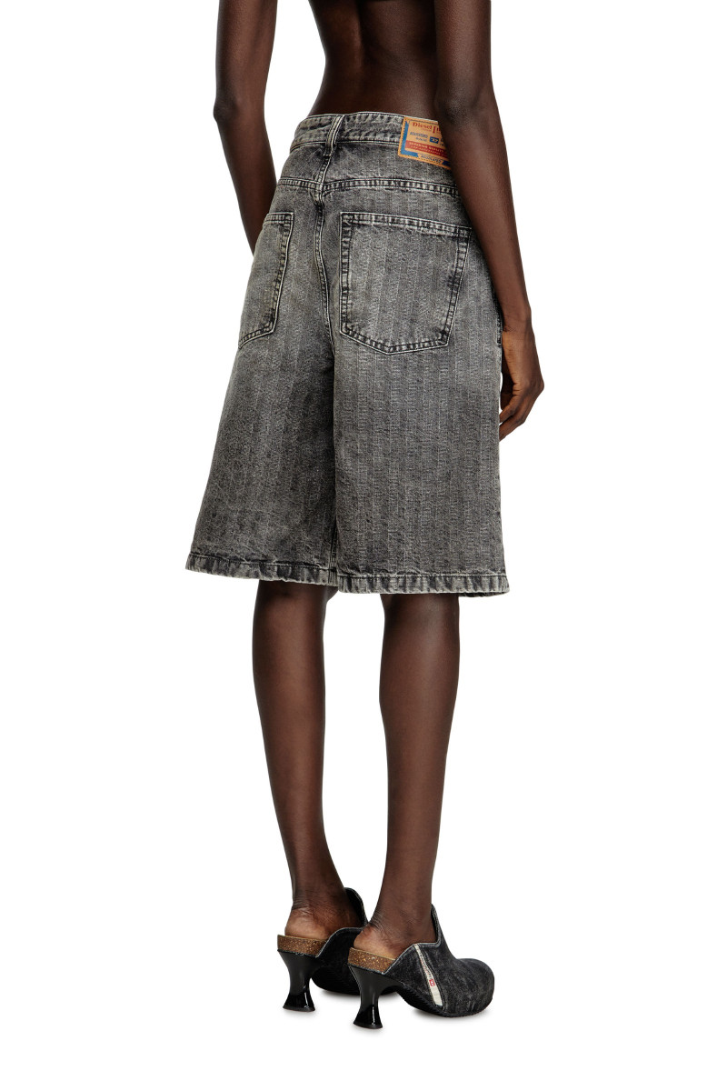 Dámske džínsové šortky s piatimi vreckami. Voľný strih po kolená s áčkovou siluetou. Vyrobené z pevného čierneho denimu. Tkanina má vzor rybej kosti, ktorý vytvára jemný pruhovaný efekt, zvýraznený mramorovým praním a ručne vyrobenými odreninami. Detaily špiny v odtieňoch hnedej podčiarkujú prirodzený, oživený vzhľad. Toto pranie DNA je súčasťou dedičstva značky Diesel a klasických štýlov. Zapína sa na klopu a gombík. Pútka na opasok. Modelka má na sebe veľkosť 26 a je vysoký 175 cm.